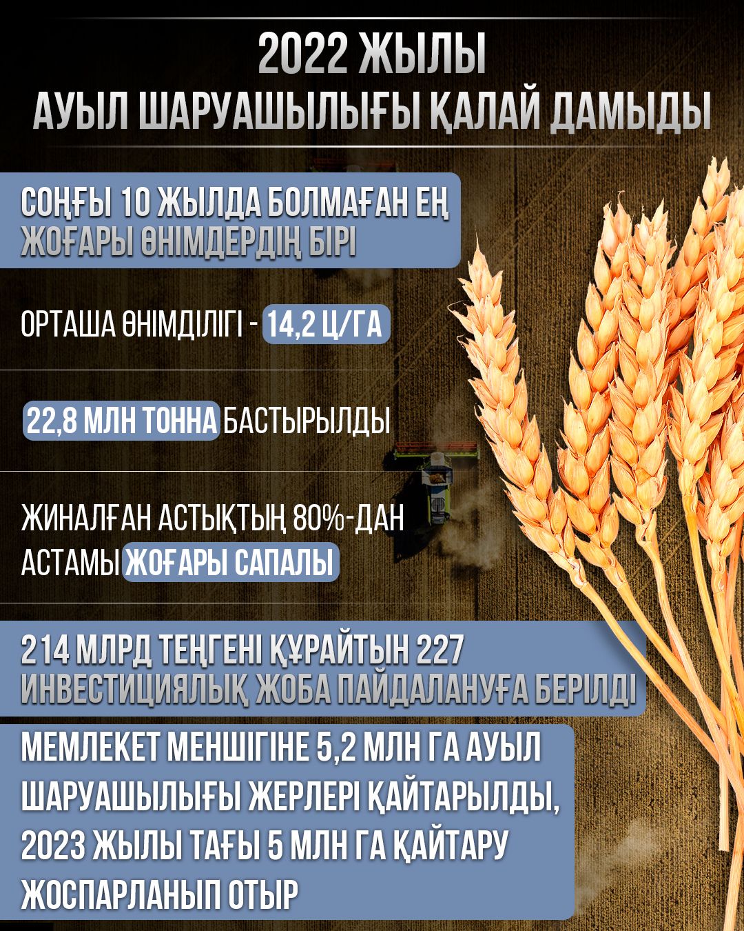Мемлекеттік қолдаудың арқасында 2022 жылы 214 млрд теңгені құрайтын 227 инвестициялық жоба пайдалануға берілді, ал жыл соңына дейін олардың санын 237-ге жеткізу жоспарлануда. Мемлекет меншігіне 5,2 млн га ауыл шаруашылығы жерлері қайтарылды, 2023 жылы тағы 5 млн га қайтару көзделген. Сондай-ақ көкөніс қоймаларын салу және жаңғырту жөніндегі кешенді жоспар одан әрі іске асырылды, оның шеңберінде 2021-2022 жылдары қуаты 201,1 мың тонна болатын қоймалар іске қосылды (бұл – жоспардың 111%-ы).
