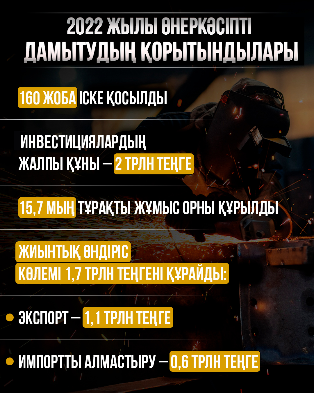 Жалпы, 2022 жылғы барлық жаңа жобалар жобалық қуаттылығына шыққан кезде олардың жиынтық өндіріс көлемі шамамен 1,7 трлн теңгені құрайды, оның ішінде экспорт – 1,1 трлн теңге, импортты алмастыру – 0,6 трлн теңге.