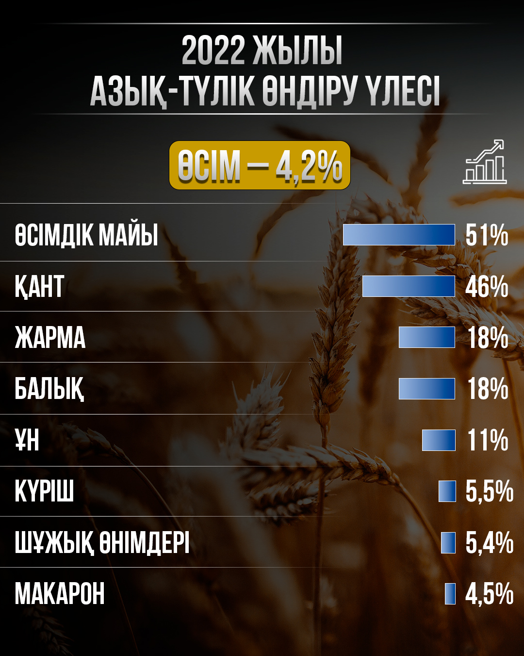 Айта кетейік, негізгі азық-түлік тауарларымен өзін-өзі толық қамтамасыз ету жөніндегі индикаторларға қол жеткізу үшін осы жылы елдің Азық-түлік қауіпсіздігін қамтамасыз етудің 2024 жылға дейінгі жоспары және қант саласын дамытудың бес жылдық кезеңге арналған кешенді жоспары қабылданды. Нәтижесінде республикада азық-түлік өндірісі 4,2%-ға, оның ішінде өсімдік майы 51%-ға, қант 46%-ға, жарма 18%-ға, балық (жаңа ауланған, салқындатылған және мұздатылған) 18%-ға, ұн 11%-ға, өңделген күріш 5,5%-ға, шұжық өнімдері 5,4%-ға, макарон 4,5%-ға өсті.