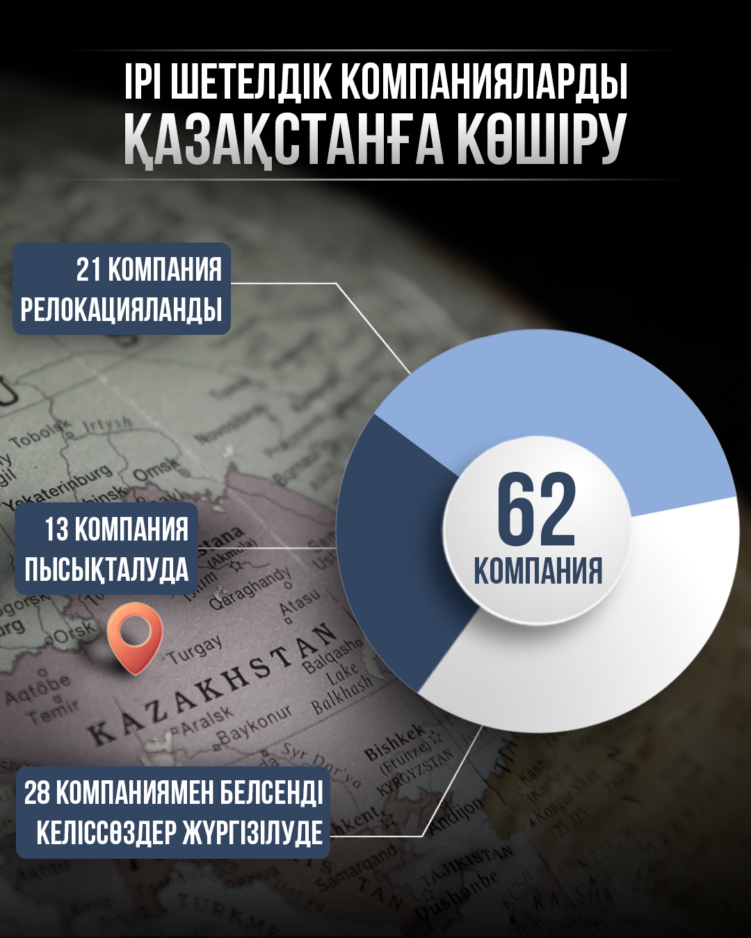 Жыл бойы Үкімет Қазақстанға бірқатар ірі шетелдік компанияны көшіру бойынша белсенді жұмыс жүргізді. 62 компания бойынша нақты нәтижелерге қол жеткізді: 21-і релокацияланды, 13-і пысықталуда, тағы 28-імен белсенді келіссөздер жүргізілуде.
