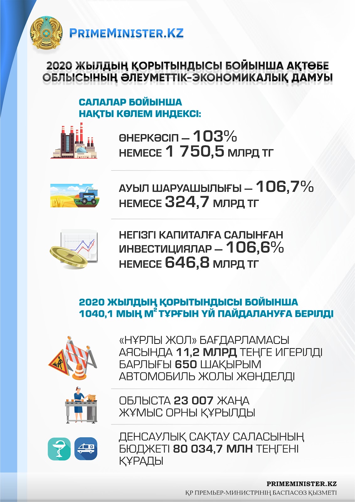 2020 жылы Ақтөбе облысында коронавирус инфекциясы пандемиясы кезеңінде экономикалық көрсеткіштердің күрт төмендеуіне жол берілмеді. Бұл көп жағдайда өңір кәсіпорындарымен нақты жұмыс істеудің, әлеуметтік саладағы проблемалық мәселелерді дер кезінде анықтаудың және оларды шешудің арқасында мүмкін болды. Өткен жылы облыстың қалай дамығаны туралы PrimeMinister.kz шолуынан оқыңыздар.