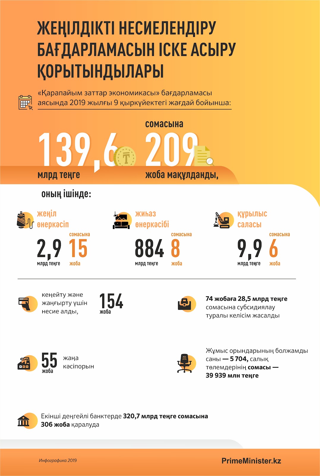 ҚР ҰЭМ деректері бойынша, Бағдарлама іске асырыла бастаған уақыттан бастап (биылғы 27 наурыздан бастап) 2019 жылғы 9 қыркүйектегі жағдай бойынша 139,6 млрд теңге сомасына 209 жоба мақұлданды, оның ішінде: жеңіл өнеркәсіп, жиһаз өнеркәсібі, құрылыс саласында.