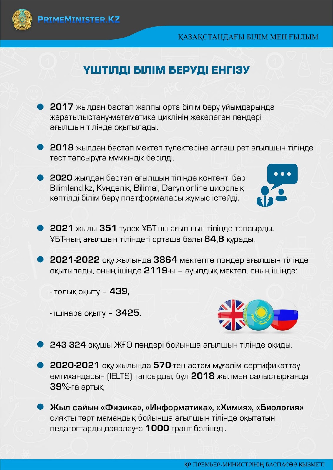 2017 жылдан бастап жалпы орта білім беру ұйымдарында жаратылыстану-математика циклінің жекелеген пәндері ағылшын тілінде оқытылады. Оқыту ата-аналар мен білім алушылардың пікірін, педагогтердің дайындығын ескере отырып, сондай-ақ мектептің педагогикалық кеңесінің шешімі негізінде жүргізіледі.