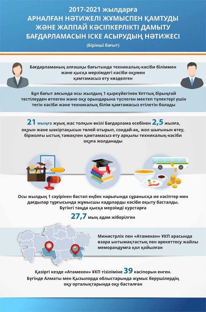 Сонымен қатар аймақтарда кадрлар даярлауға үміткерлер тізімін құратын 1844 мобильді топ құрылды. 586 біліктілік бойынша жұмысшы кадрларын (сервис және қызмет көрсету, техникалық, технологиялық, ауыл шаруашылығы) даярлау үшін 317 білім беру ұйымымен 271 басымдықты мамандықтан тұратын тізім анықталды.