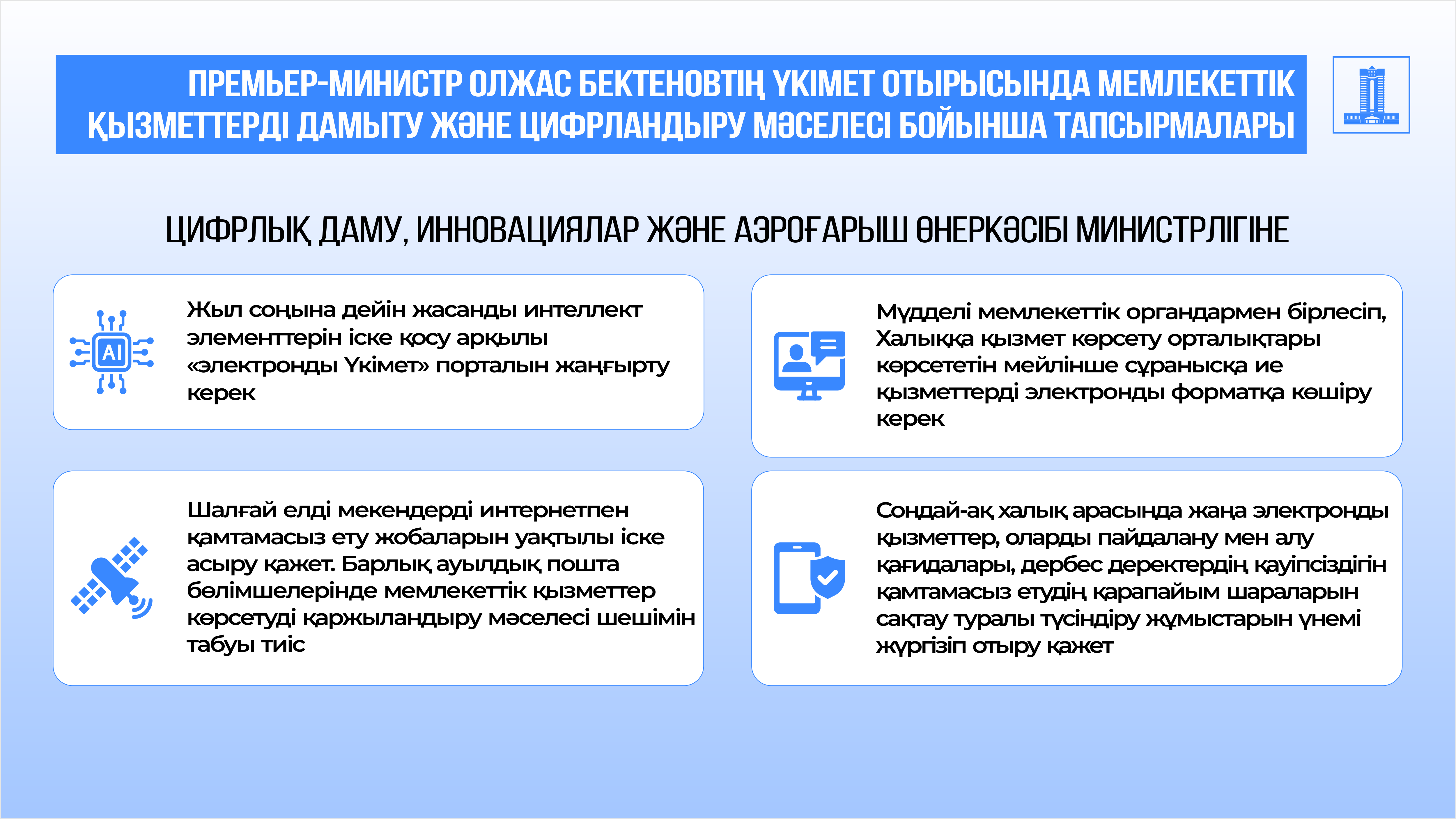 Үкімет отырысының қорытындысы бойынша Премьер-министр бірқатар тапсырма берді