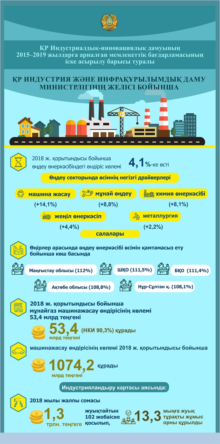 «Есепті кезеңде жалпы ішкі өнімдегі өңдеу өнеркәсібінің үлесі 10,1%-тен 11,6%-ке дейін, саладағы жұмыспен қамтылғандар үлесі 6,6%-тен 6,9%-ке дейін өсті. 2018 жылғы қорытынды бойынша өнеркәсіп 4,1%-ке өсті. Бұл өңдеу өнеркәсібінің 4%-ке қарқынды өсуі есебінен іске асырылып отыр», — деді министр Р. Скляр.