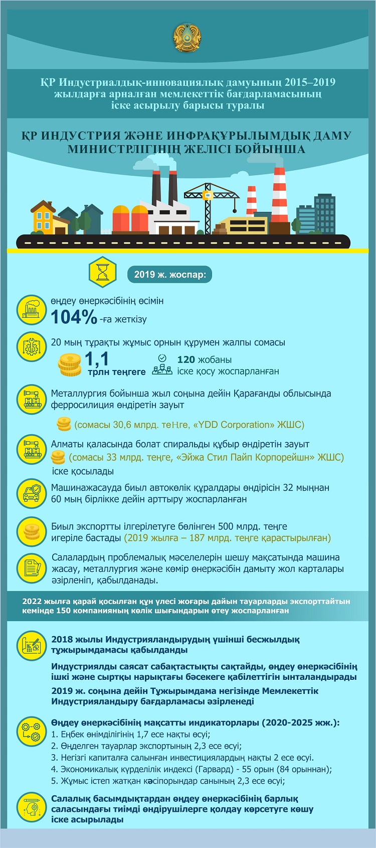 Биыл жыл соңына дейін индустрияландырудың үшінші бесжылдығының Тұжырымдамасы негізінде Мемлекеттік индустрияландыру бағдарламасы әзірленеді. Салалық басмыдықтардан өңдеу өнеркәсібінің барлық салаларында тиімді өндірушілерді қолдауға көшу іске асырылады. Нақты көрсеткіштерге қол жеткізу бойынша бизнес міндеттемелерінің орнына тікелей қолдау көрсетіледі (жаңғырту, экспорт өсімі және т.б.). Сонымен қатар, кәсіпорындарды жаңғырту мен технологиялық дамытуға бағытталған қолданыстағы құралдар жетілдіріледі және жаңа құралдар әзірленеді. Жалпы, индустриялық саясат сабақтастықты сақтайды, өңдеу өнеркәсібінің ішкі және сыртқы нарықтағы бәсекеге қабілеттігін ынталандырады.