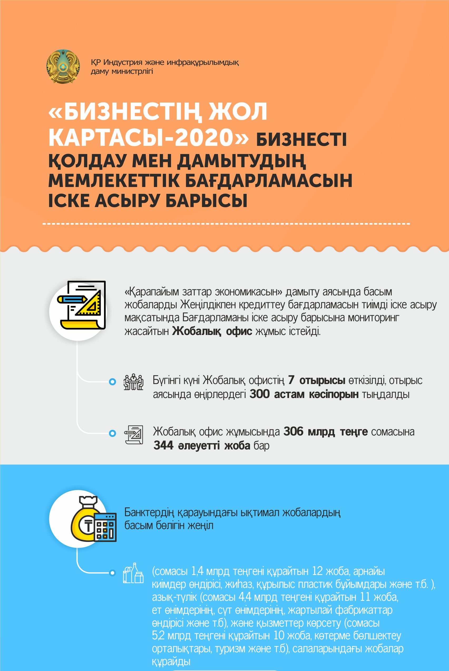 «Бүгінде Жобалық офистің 7 отырысы өткізілді, отырыс аясында өңірлердегі 300-ден астам кәсіпорын тыңдалды. Жобалық офис жұмысында сомасы 306 млрд теңгені құрайтын 344 әлеуетті жоба бар, оның ішіндегі 6,1 млрд теңге болатын 10 жобаны екінші деңгейлі банктер мақұлдады, сомасы 16,6 млрд тг болатын 52 жоба екінші деңгейлі банктердің қарауында», — деді Р. Скляр. Банктерде қаралып жатқан әлеуетті жобалардың негізгілері жеңіл, тамақ өнеркәсібі және қызмет көрсету салаларынан.