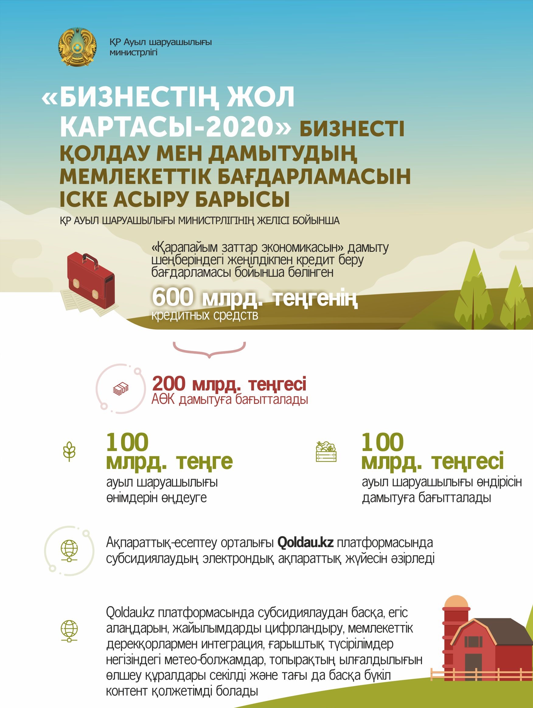 Ауыл шаруашылығы министрі Сапархан Омаров жеңілдікті несиелендіру бағдарламасы бойынша АӨК дамытуға бөлінген 200 млрд теңгеден 100 млрд теңгесі ауыл шаруашылығы өнімдерін қайта өңдеуді дамытуға жұмсалатынын айтты. Онда мөлшерлеме «БЖК–2020» есебінен субсидияланады. Тағы 100 млрд теңгесі ауыл шаруашылығы өндірісін дамытуға бағытталады — мөлшерлеме Ауыл шаруашылығы министрлігінің бағдарламасы бойынша субсидияланады, бюджетте аталған мақсаттарға қажетті қаражат бар.