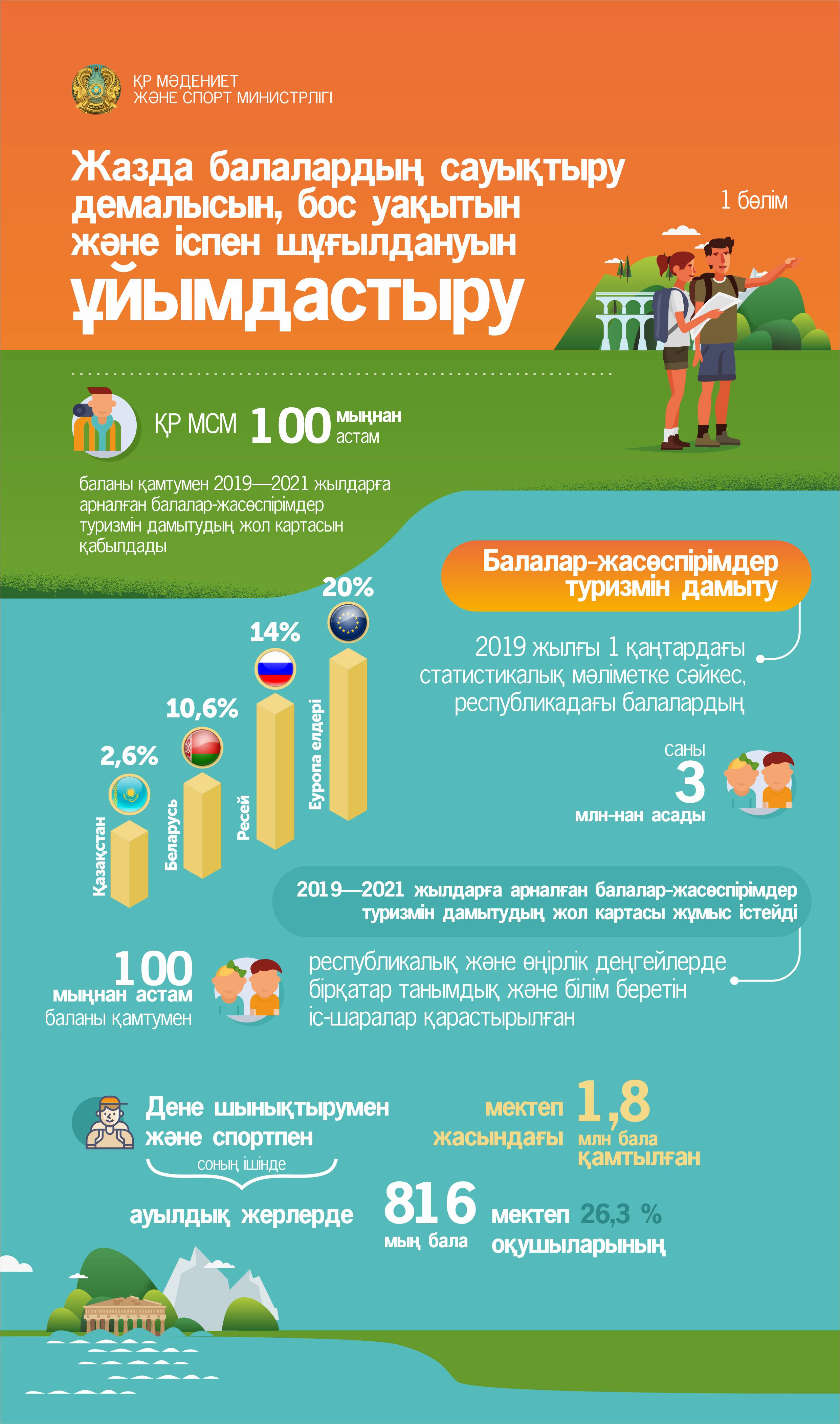 Негізінен балалар жазғы демалыстарын өздерінің үйреншікті ортасында өткізеді. Балалардың 40%-ы өзінің тұрғылықты жерінен тысқары шығады. ҚР БҒМ олардың демалыс сапасын елімізде қалыптасқан инфрақұрылымды жан-жақты пайдалану арқылы жақсартуды ұсынады.