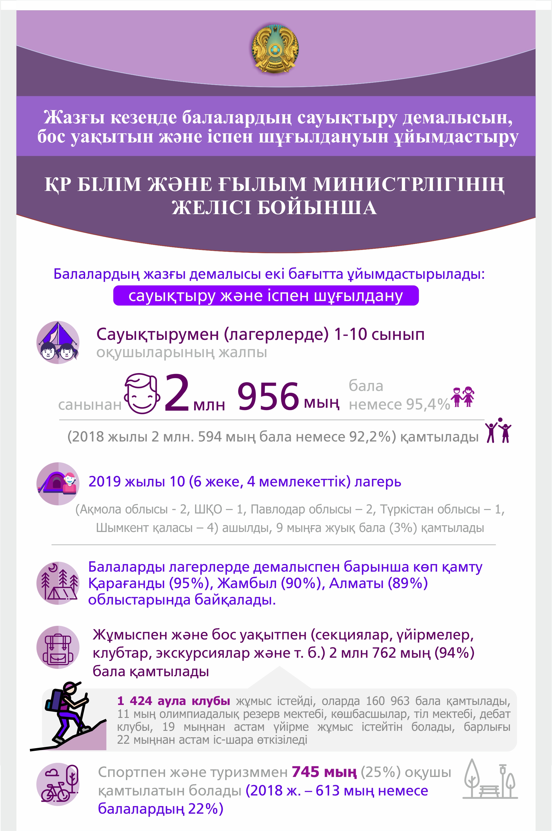 Лагерлердегі демалыспен әлеуметтік аз қамтамасыз етілген отбасылардың балаларының 80%-ын, айрықша білім қажеттілігіне мұқтаж балалардың 82%-ын және түрлі салада жетістікке жеткен, девиантты тәрбиедегі балалардың 90%-ын қамту көзделуде. 960 мың бала (33%) жазда құрылыс отрядтарына, орман шаруашылығына және көгалдандыру жұмыстарына тартылады.