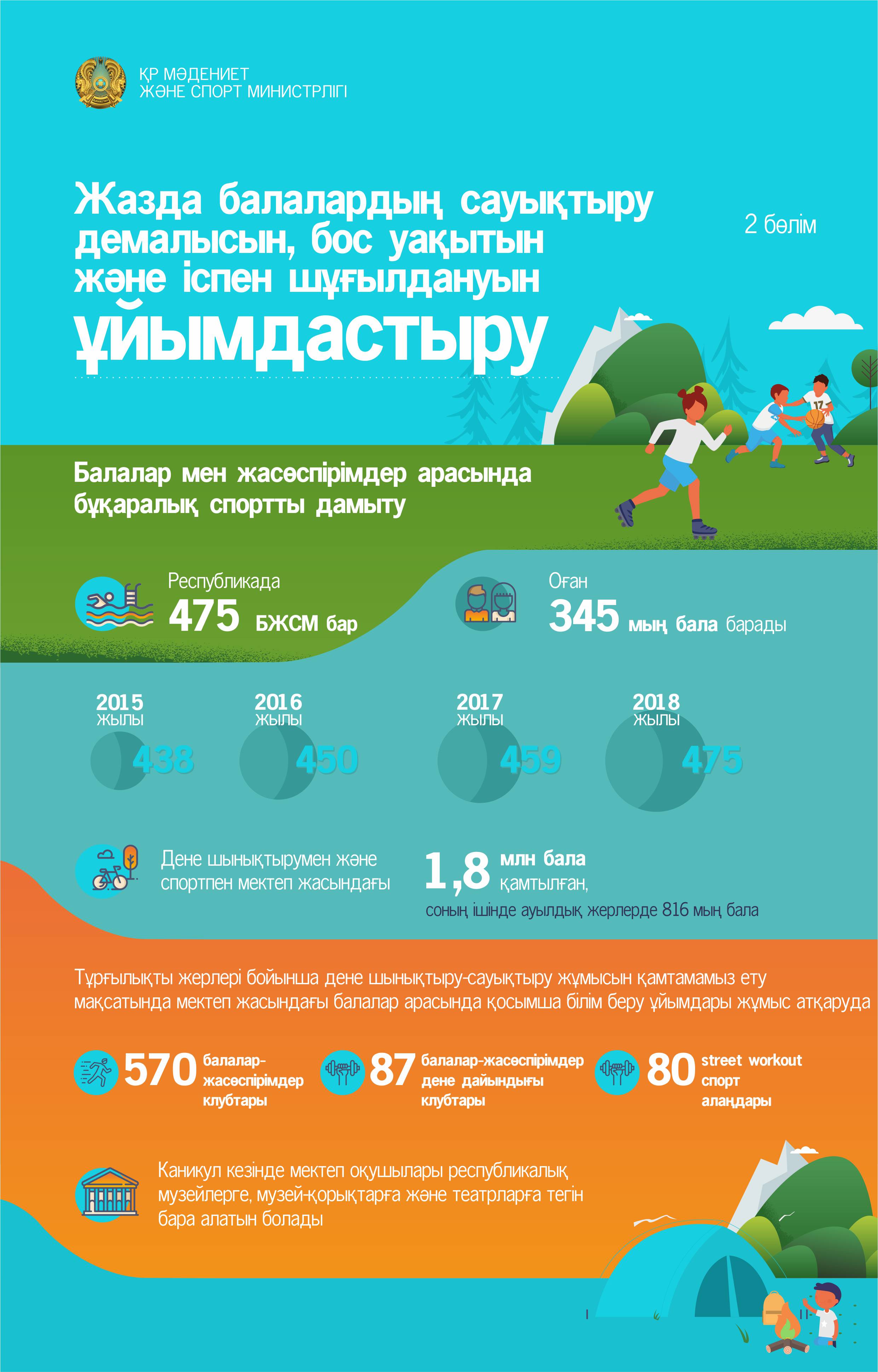 «Былтыр экономиканың түрлі салаларындағы компаниялар мен жеке кәсіпкерлер осы шараға атсалысып, 504 млн теңгеге 4 324 баланың демалысын ұйымдастыруға қолдау көрсетті. Биыл да бұл шара жалғасын табады», — деді білім және ғылым министрі.