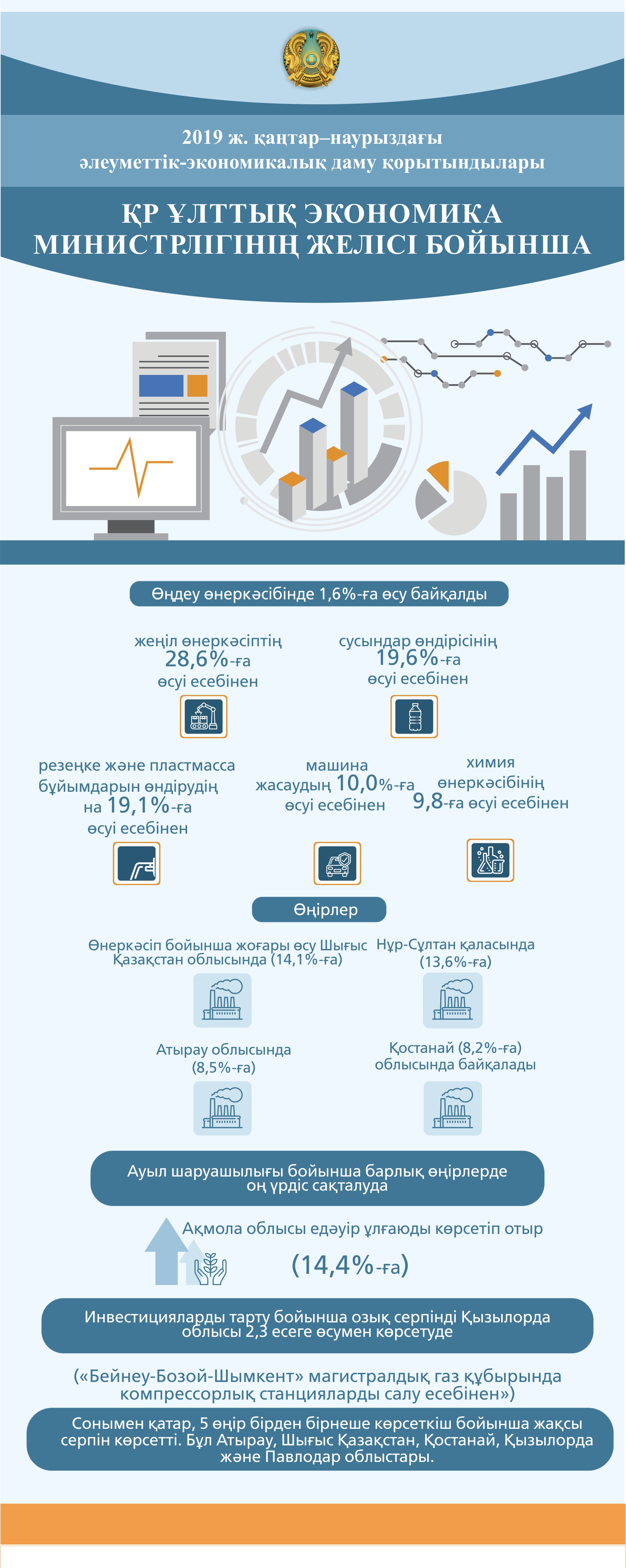 Биылғы қаңтар–наурызда өнеркәсіп өндірісі 3,2% өсті. Өңдеу өнеркәсібінің көптеген салаларында екі таңбалы өсу байқалды. Бұл — жеңіл өнеркәсіп, сусындар және пластмасса бұйымдарын өндіру, құрылыс материалдарын шығару, сондай-ақ машина жасау, оның ішінде автокөлік жасау.