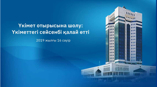 Үкіметтің кезекті отырысында 2019 жылдың І тоқсанындағы ҚР әлеуметтік-экономикалық дамуының және республикалық бюджеттің орындалуының көрсеткіштері, сондай-ақ, шикізаттық емес экспортты ілгерілету және Ұлттық экспорттық стратегияны іске асыру барысы қаралды. Үкімет кулуарында БАҚ қызығушылық танытатын мәселелерді талқылау жалғастырылды.