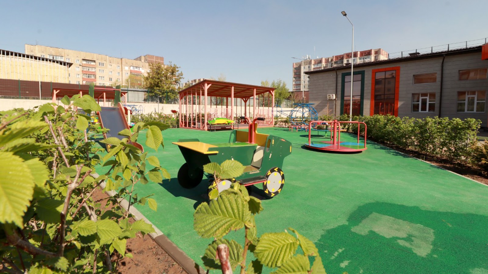 Балабақша аумағында гүлзарлар мен көгалдар, 50 жеміс ағашы отырғызылған (алма, шие, алмұрт, қара өрік) бақ бар. Сондай-ақ үлкен ойын кешені және футбол алаңы бар. Спорт залында болашақ чемпиондардың жаттығуы үшін мүмкіндіктер қарастырылған.