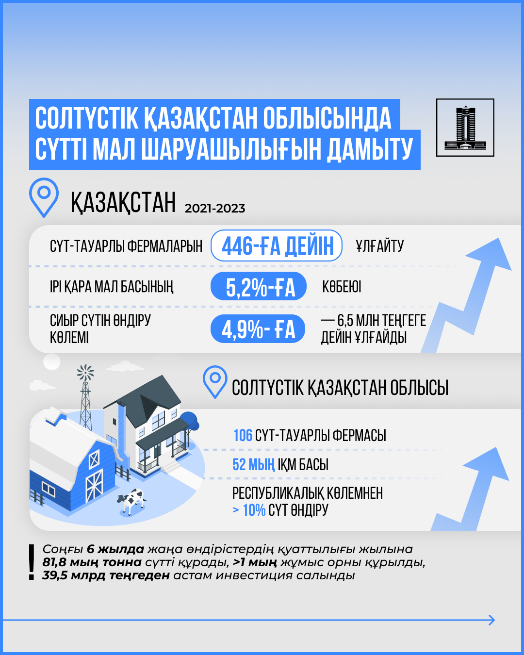 СҚО-да соңғы 6 жылда мал басының жалпы саны 16 мың сиырдан асатын және қуаты 81,8 мың тонна сүт өндіретін 30-дан астам сүт фермасы іске қосылды. Сондай-ақ бұл 1 мыңнан астам жаңа жұмыс орнын ашуға мүмкіндік берді. Жобаларды іске асыруға 39,5 млрд теңге инвестиция салынды.