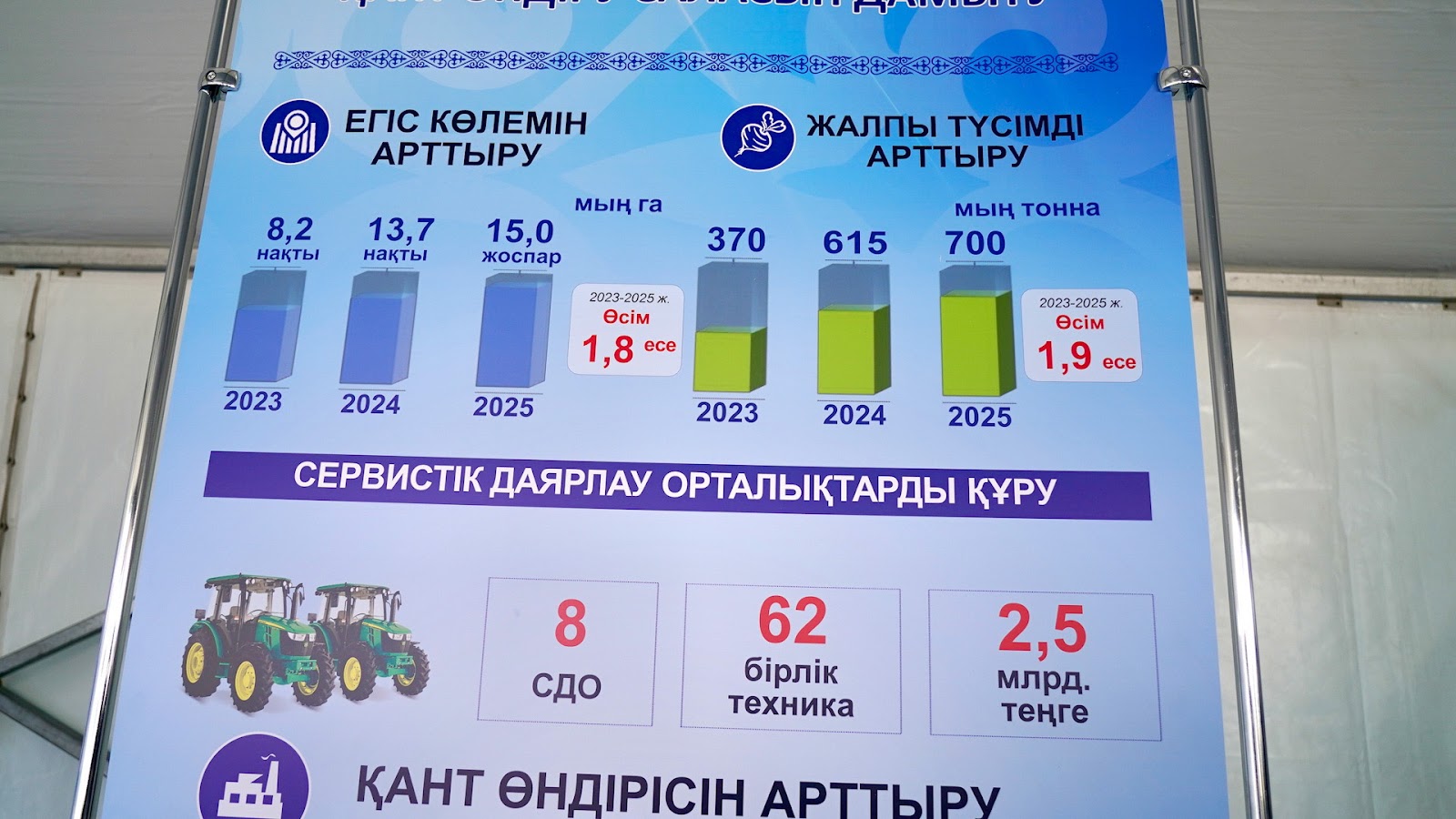 «Жетісу облысы аграрлы өңір болып саналады. Үкімет өңірдің АӨК-не қажетті қолдау көрсетіп келеді. Тек биылдың өзінде 34,9 млрд теңге, оның ішінде 23,2 млрд теңге субсидия бөлінді. Жалпы, "Ірі жобалар" және "Ауыл аманаты" бағдарламалары аясында облысқа 9,8 млрд теңге бөлінді. Осы бағдарламалардың іске асырылуын және мал шаруашылығы өнімін өндіру және қайта өңдеу бойынша жаңа кәсіпорындар ашуды қамтамасыз ету қажет», — деп атап өтті Олжас Бектенов. Премьер-Министр еліміздің азық-түлік қауіпсіздігін қамтамасыз ету үшін ауыл шаруашылығы өнімдерін терең өңдеу көлемін ұлғайту қажет екенін атап өтті.
