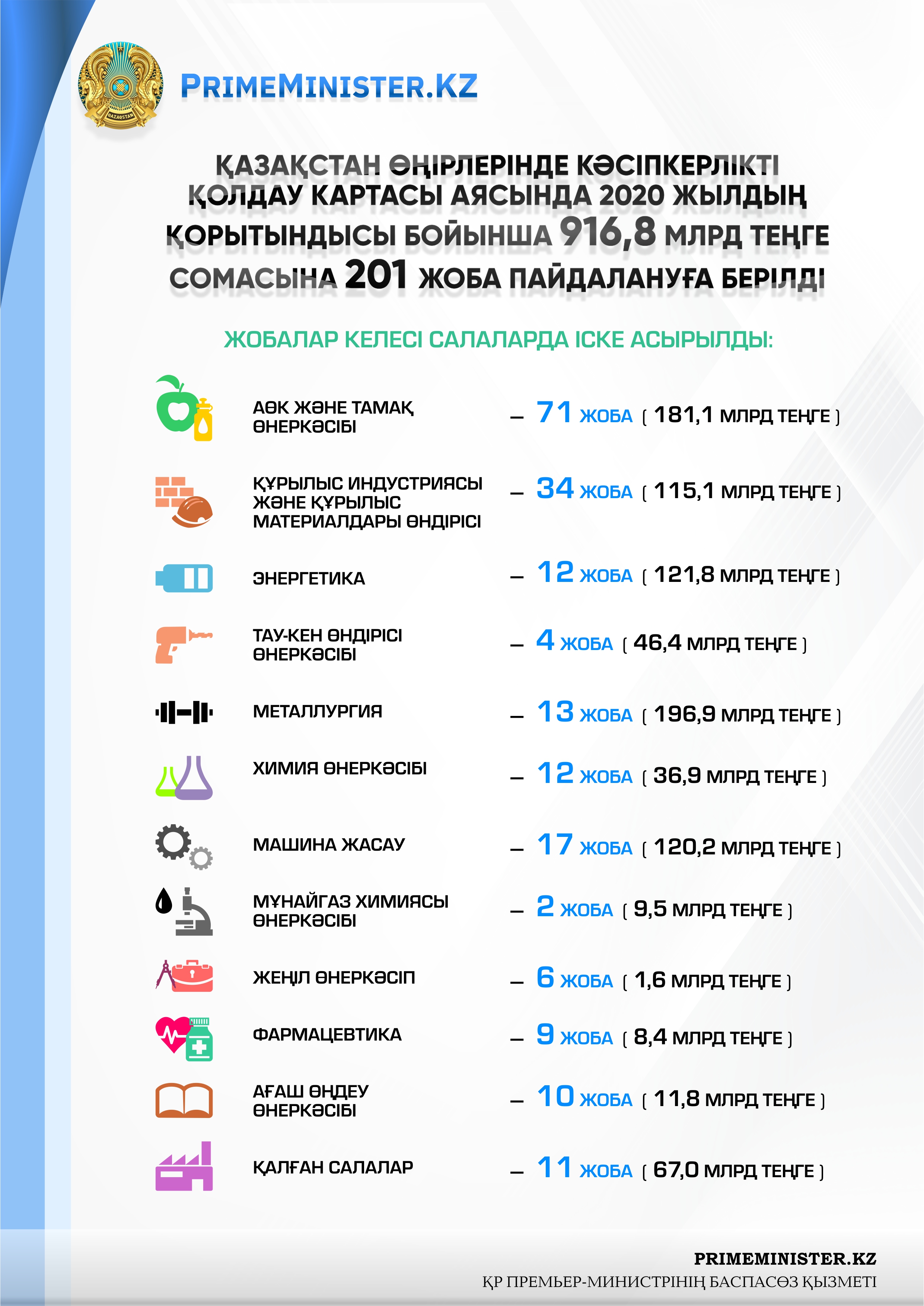 Өңірлердің кәсіпкерлікті қолдау картасы шеңберінде 2020 жылдың қорытындысы бойынша 18,6 мың тұрақты жұмыс орнын құра отырып, 916,8 млрд теңге сомасына 201 жоба пайдалануға берілді.