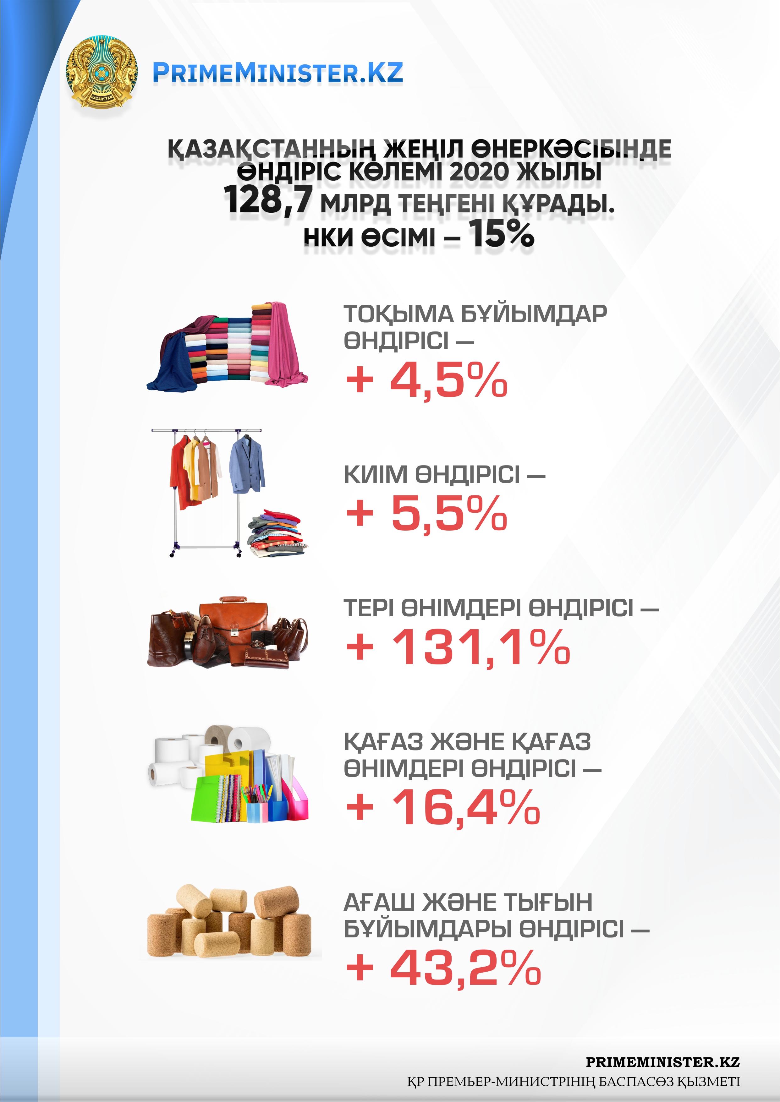 2020 жылдың қаңтар-желтоқсан айларында жеңіл өнеркәсіп өнімдерін өндіру көлемі 128,7 млрд теңгені құрады, нақты көлем индексінің өсуі 2019 жылдың сәйкес кезеңімен салыстырғанда 15%. Өсім жеңіл өнеркәсіптің барлық шағын салаларында байқалады.