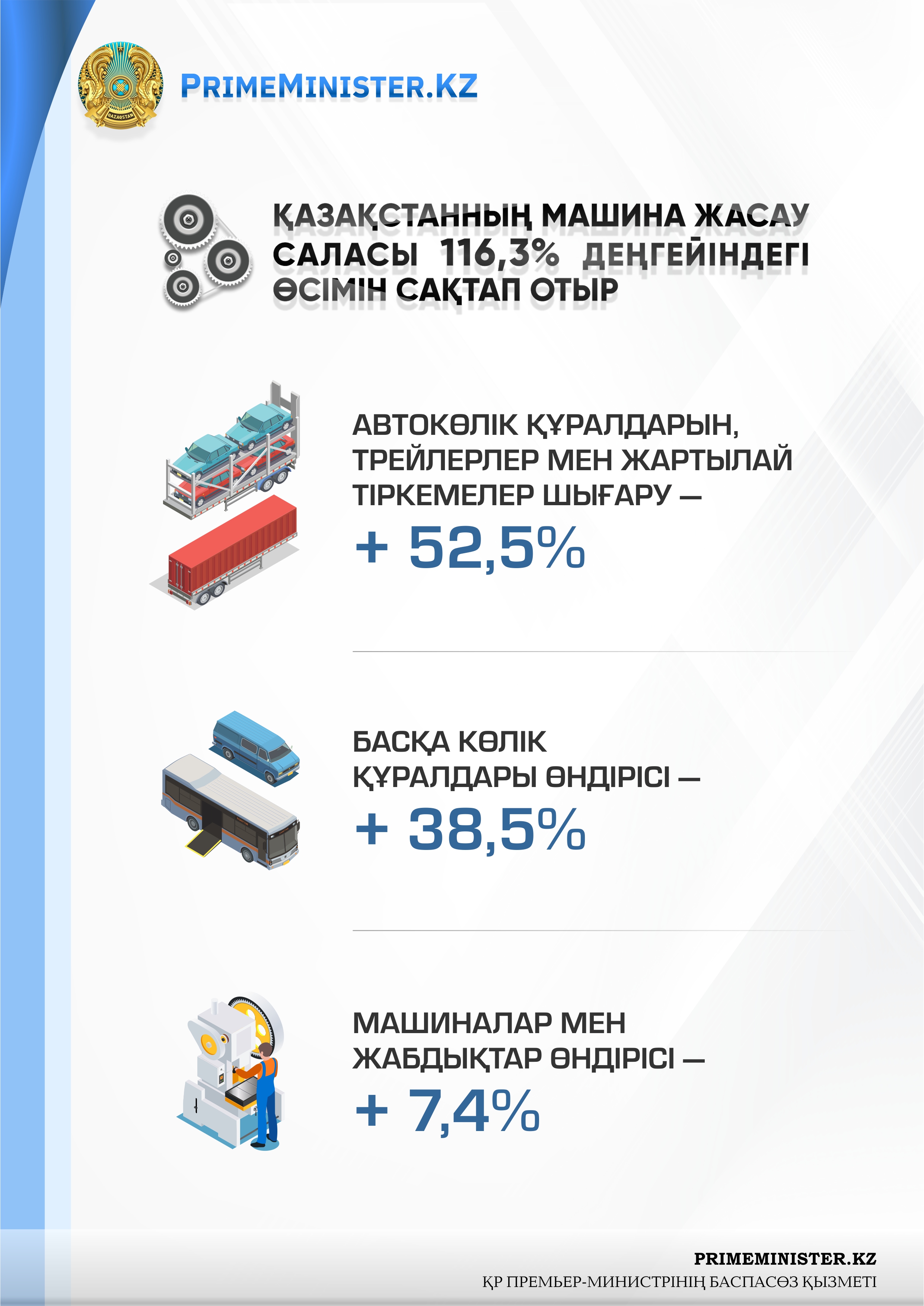 Өнеркәсіптің ең ірі салаларының бірі — машина жасау саласы 116,3% деңгейінде тұрақты өсуді сақтап отыр. 2020 жылы сала көрсеткіштерінің ұлғаюы автокөлік құралдарын, трейлерлер мен жартылай тіркемелерді (+52,5%) шығару, өзге көлік құралдарын (+38,5%), машиналар мен жабдықтарды (+7,4%) өндіру есебінен болды.