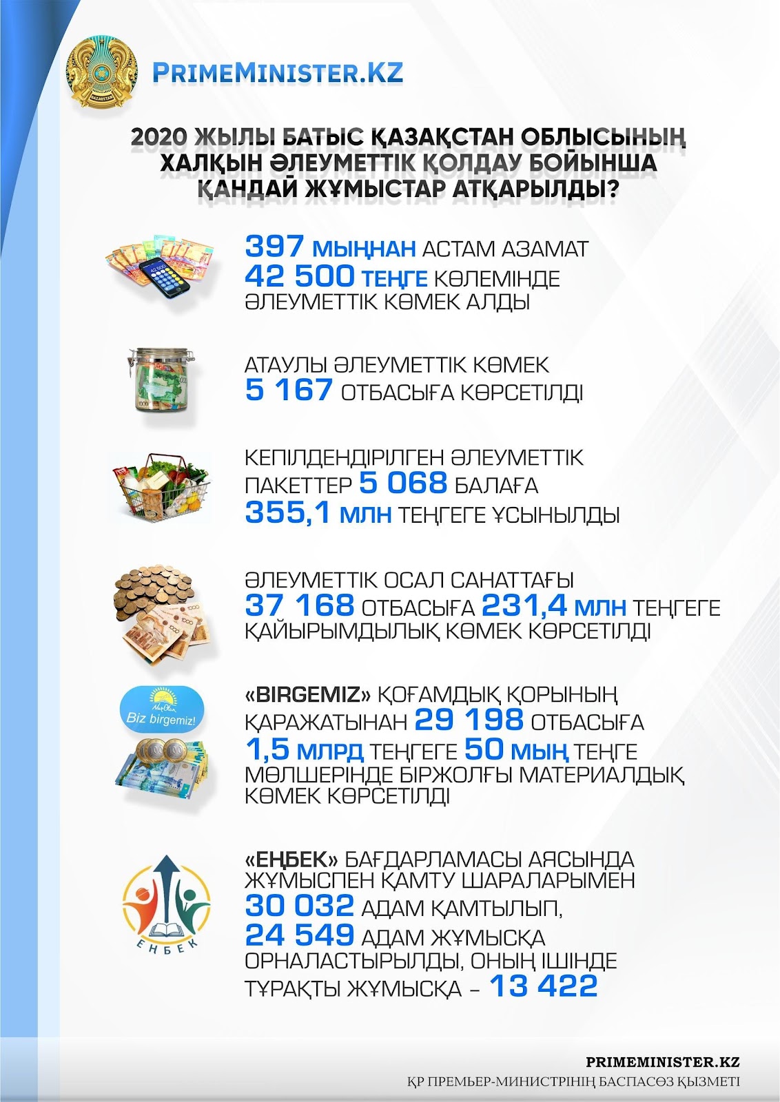Биыл елімізде енгізілген жалпы ТЖ-ға байланысты, Міндетті әлеуметтік сақтандыру қоры арқылы уақытша табыссыз қалған Батыс Қазақстан облысының 397 мыңнан астам азаматы 42 500 теңге мөлшерінде әлеуметтік көмек алды, оның ішінде 16 наурыз бен 15 сәуір аралығында 160 786 адам 6,8 млрд теңге, 16 сәуір мен 10 мамыр аралығында 90 331 адам 3,8 млрд теңге көлемінде, 5 шілде мен 16 тамыз аралығында 77 771 адам 3,3 млрд теңге көлемінде, сондай-ақ, шектеу шараларына байланысты тамыз айының соңына дейін 68 658 адам 1,5 млрд теңге сомасына әлеуметтік көмек алды.