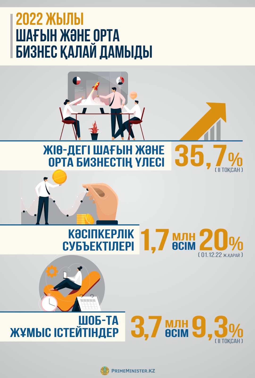 Жалпы 2022 жылы ЖІӨ-дегі шағын және орта бизнестің үлесі 35,7%-ға жетті (II тоқсан), кәсіпкерлік субъектілерінің саны 20%-ға 1,7 млн-ға дейін (1 желтоқсандағы жағдай бойынша), ал ШОБ-та жұмыспен қамтылған адамдардың саны 9,3%-ға 3,7 млн-ға дейін өсті (II тоқсан).