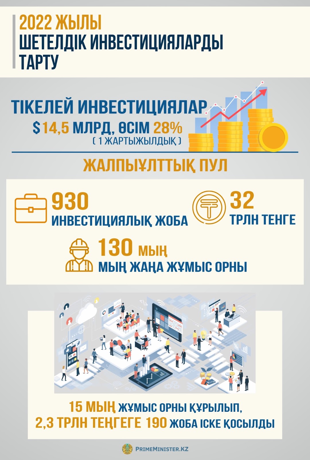 Шетелдік инвестицияларды тартуға келетін болсақ, I жартыжылдықтың қорытындысы бойынша $14,5 млрд тікелей инвестиция тартылды (өткен жылмен салыстырғанда 28%-ға көп). Жалпы сомасы шамамен $32 трлн инвестиция тарта отырып, 930 жобадан тұратын (әлемнің 30-дан астам елінен) жалпыұлттық пул бойынша жұмыс жүргізіліп жатыр, ол шамамен 130 мың жұмыс орнын құруды көздейді. Бүгінгі таңда 15 мың жұмыс орнын құруға мүмкіндік беретін 2,3 трлн теңгеге 190 жоба іске қосылды, оның ішінде шетелдік компаниялардың қатысуымен жалпы құны 1,7 трлн теңге болатын 45 жоба бар.