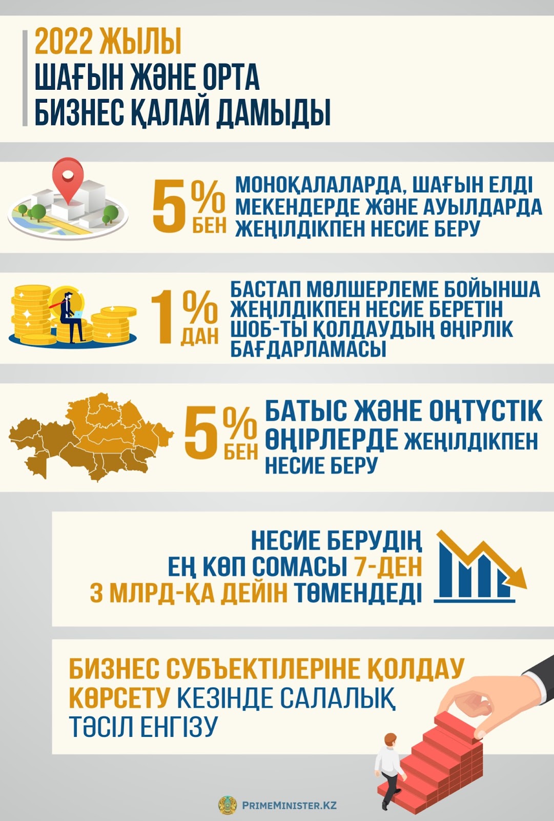 Биыл кәсіпкерлікті дамыту бойынша бірқатар басқа да шаралар қабылданды. Мәселен, моноқалаларда, шағын елді мекендерде және ауылдарда 5% жеңілдікпен шағын несие беру енгізіліп, 1%-дан бастап мөлшерлеме бойынша жеңілдікпен несие беретін ШОБ-ты қолдаудың өңірлік бағдарламасы іске қосылды, сондай-ақ батыс және оңтүстік өңірлер үшін 5% жеңілдікпен несие беріле бастады. Несиелеудің ең жоғары сомасы 7-ден 3 млрд теңгеге дейін төмендетілді, бұл бизнес субъектілерін мемлекеттік қолдау шараларымен қамтуды ұлғайтуға мүмкіндік берді және қолдау көрсету кезінде салалық тәсіл енгізілді.