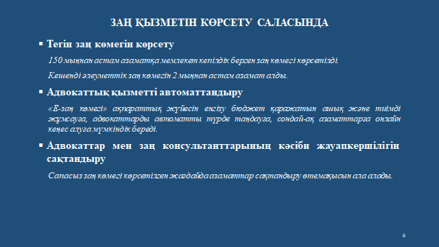 Оы мақсатта «Е-заң көмегі» ақпараттық жүйесін енгізілді. Нәтижесінде адвокаттарды тағайындау автоматты түрде таңдау жолымен жүзеге асырылатын болады, сондай-ақ азаматтарға осы жүйе арқылы онлайн кеңес алуға мүмкіндік береді.