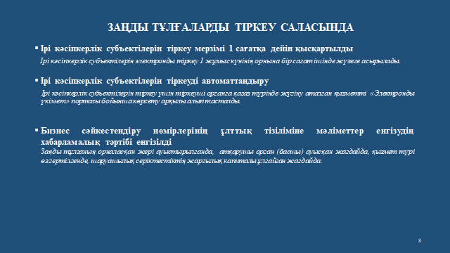 Сонымен қатар заңды тұлғалардың ыңғайлылығы үшін «Электронды үкімет» порталында заңды тұлғаның орналасқан жері ауысқан кезде; атқарушы орган (басшы)ауысқан кезде; шаруашылық жүргізуші серіктестіктің қызмет түрі ауысқан және жарғылық капиталы ұлғайған кезде Бизнес-сәйкестендіру нөмірлерінің ұлттық тізіліміне мәліметтерді енгізудің хабарлама тәртібі енгізілді. Бұл қағаз тасығыштарда хабарламалар беруді жояды, тиісінше кәсіпкерлік субъектілерінің уақыты мен шығындарын үнемдеуге мүмкіндік береді.