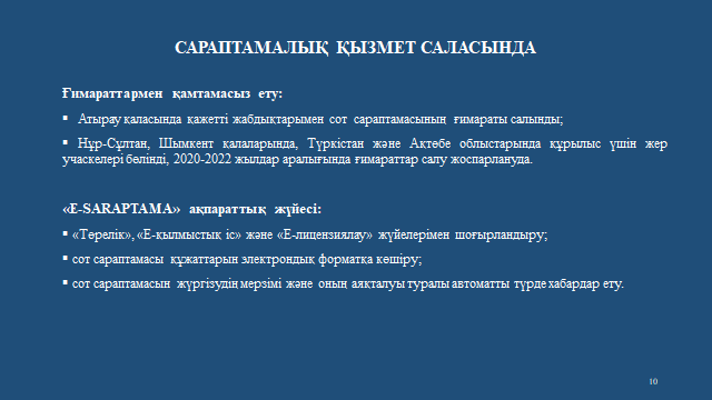 Министрлік «Е-saraptama» ақпараттық жүйесін әзірледі. Оны «Төрелік», «Е-қылмыстық іс» және «Е-лицензиялау» ақпараттық жүйелерімен шоғырландыру бойынша жұмыс жүргізілді. Биыл өнеркәсіптік пайдалануға беру жоспарлануда.