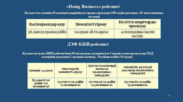 «Doing Business» рейтингісінде Қазақстан әлемнің алдыңғы қатарлы 30 елінің қатарына енді және 190 елдің арасында 25-орынға ие болды.