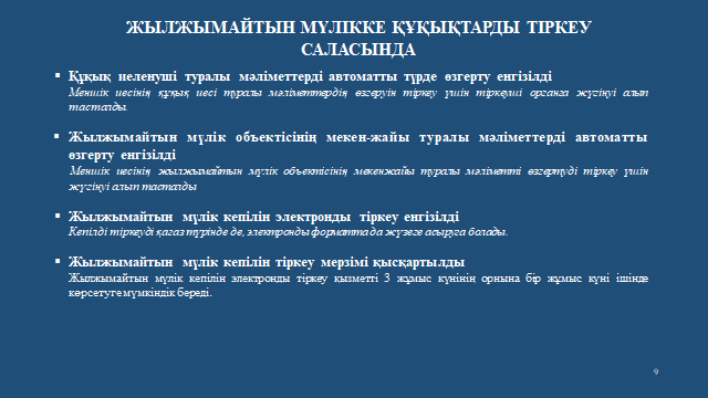 Енді жылжымайтын мүлік иелерінің тіркеуші органға жүгінуінің және аталған өзгерістерді тіркеу бойынша шығындарды өтеудің қажеті жоқ, өйткені жаңартылған мәліметтер мемлекеттік органдардың тиісті ақпараттық жүйелерінен құқықтық кадастрдың ақпараттық жүйесіне автоматты түрде түседі.