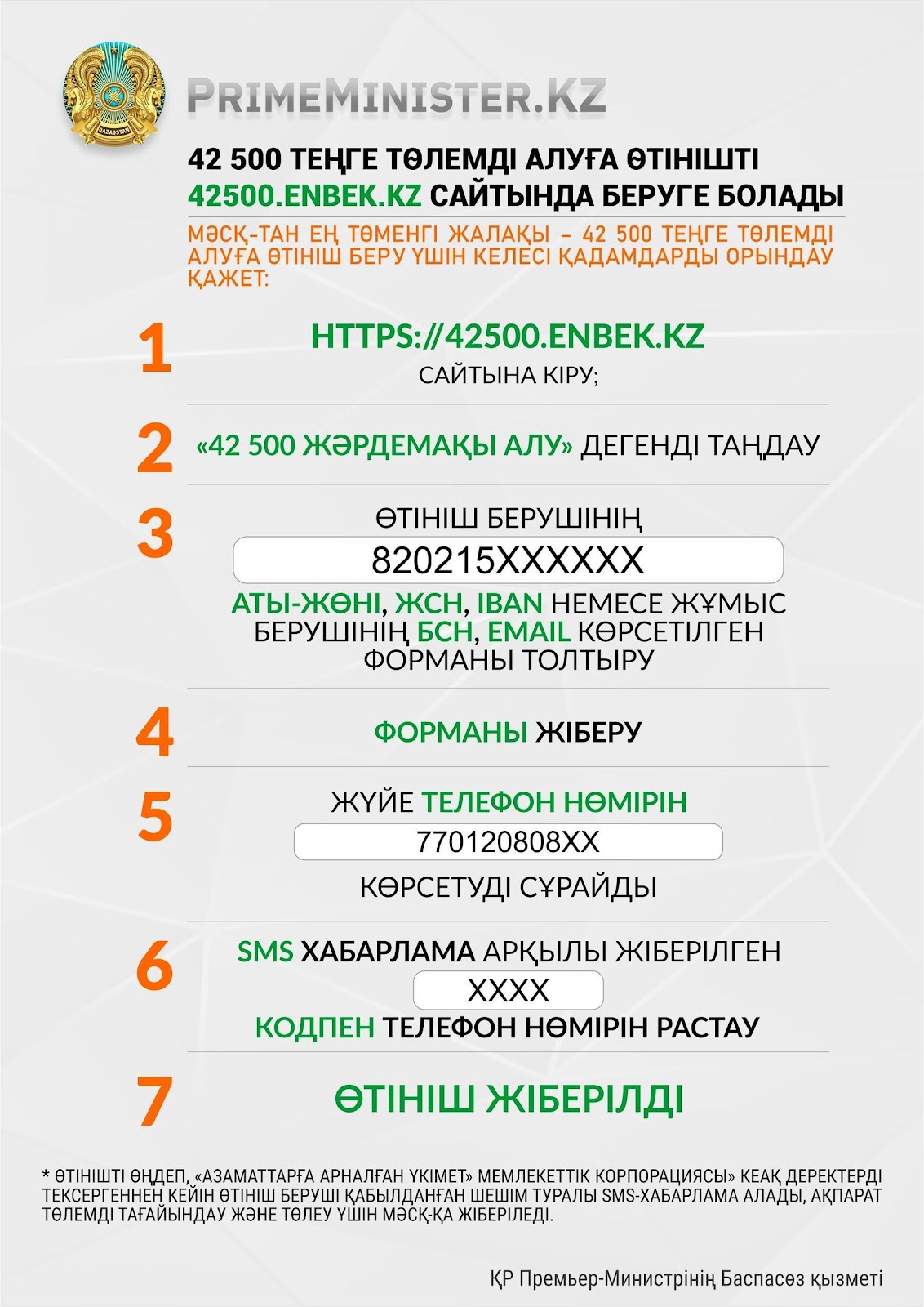 Бүгінде Egov жүктемесі тым көп, сондықтан Еңбек министрлігі BTS компаниясымен бірлесіп 42500 теңге көлеміндегі әлеуметтік төлем үшін арнайы сайт әзірледі. Онда сонымен қатар барлық азаматтар өтінім бере алады, өз мәліметтерін – толық аты-жөнін, ЖСН мен банктегі есебін көрсетеді. SMS арқылы құпиясөзді алған соң өзінің қолымен растайды.