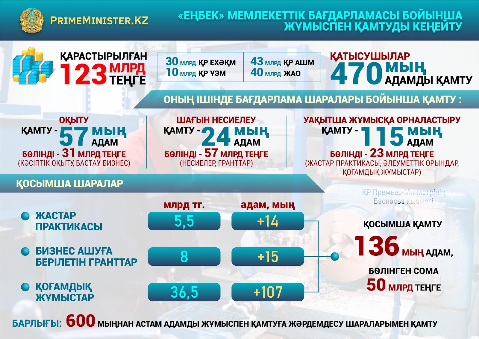 Сонымен қатар «Еңбек» мемлекеттік бағдарламасының әлеуеті толық пайдаланылады. Биыл жұмыспен қамту шараларымен 600 мыңнан аса адамды қамту көзделген. Бағдарламаны іске асыру үшін республикалық және жергілікті бюджеттерден биылғы жылға 123 млрд теңге қарастырылған.