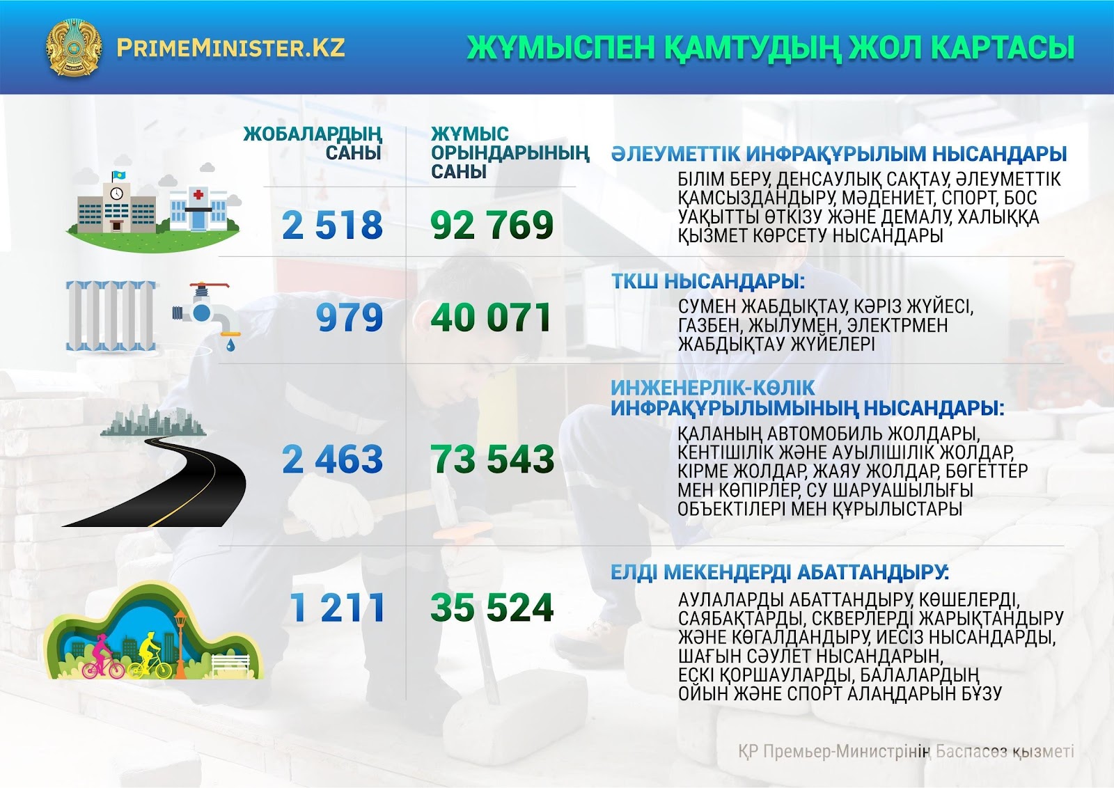 Еңбек және халықты жұмыспен қамту министрлігінің мәліметтерінше, «Жұмыспен қамтудың жол картасы» тұрғындарды жұмыспен қамтуды қамтамасыз ету мәселелерін шұғыл шешу мақсатында әзірленген және онда қосымша жұмыс орындарын құруға, жұмыссыз азаматтардың санының артуына жол бермеуге бағытталған шаралар кешені белгіленген, бұл шаралар әлеуметтік, инженерлік-көлік инфрақұрылымды және тұрғын үй-коммуналдық шаруашылығын дамыту, елді мекендерді абаттандыру бойынша инфрақұрылымдық жобаларды жүзеге асыру есебінен іске асырылады.