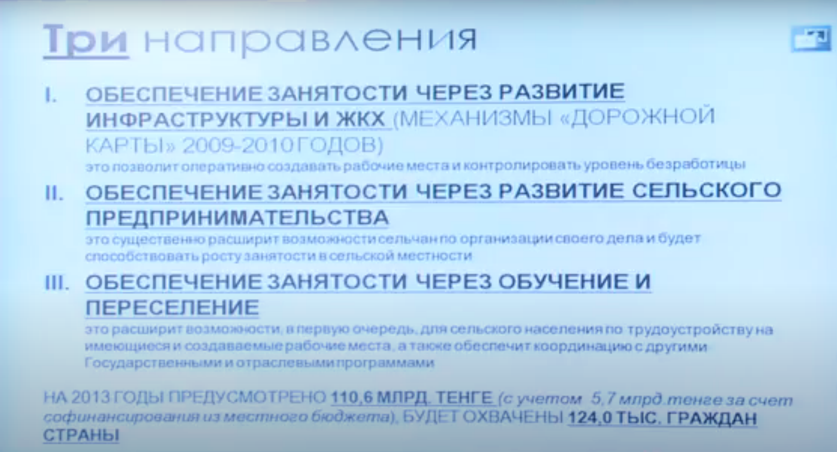 Стоит отметить, что программа занятости включает 3 основных направления: обеспечение занятости через развитие инфраструктуры и ЖКХ, через обучение и переселение и через развитие сельского предпринимательства.