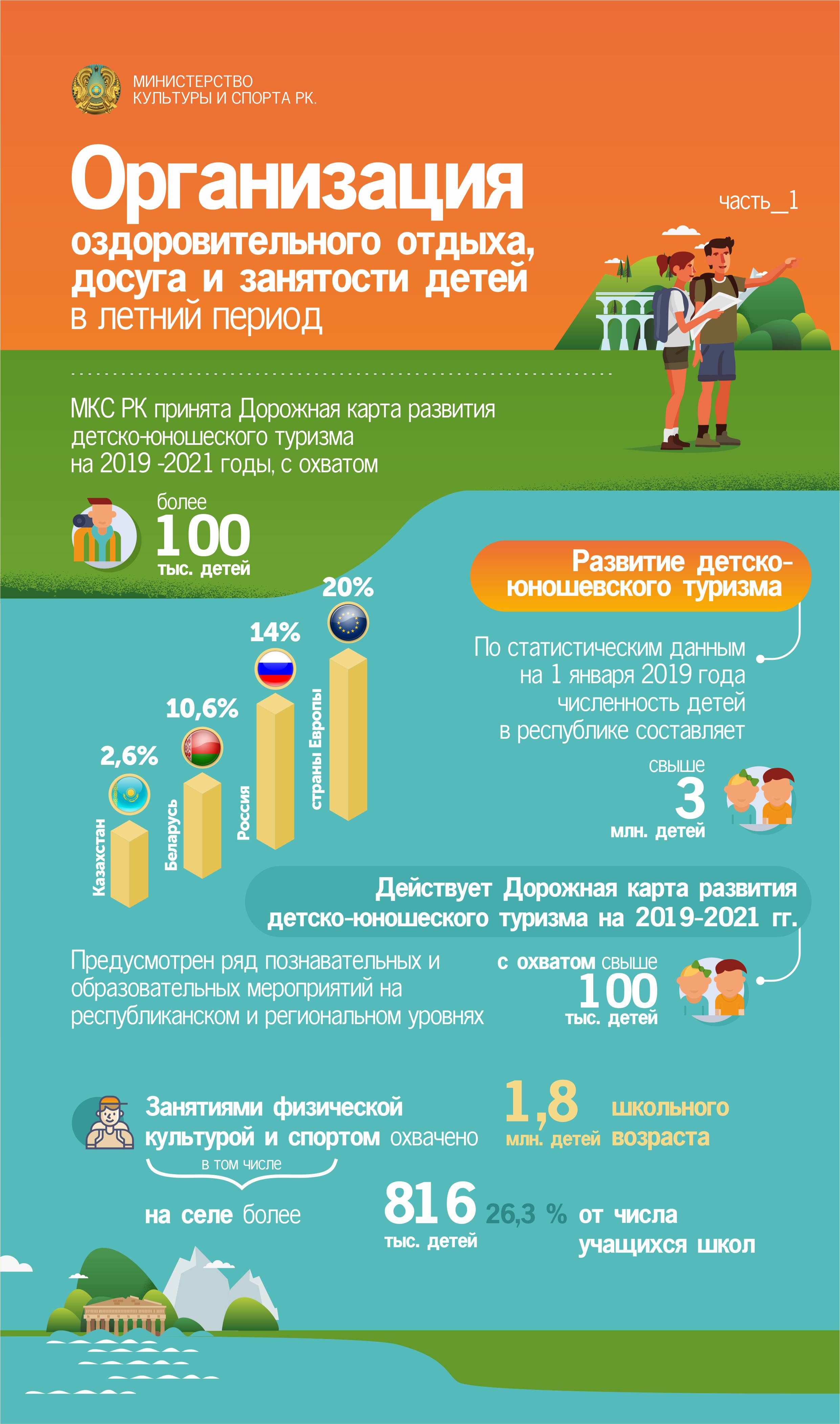 В основном дети проводят свои летние каникулы в привычной среде. 40% детей выезжают за пределы своего места жительства. Качество детского отдыха МОН РК предлагает улучшить за счет всестороннего использования инфраструктуры в стране.