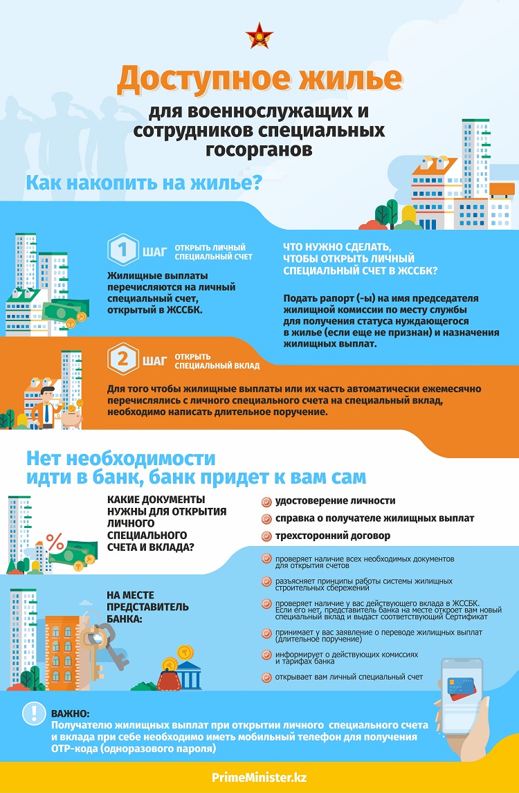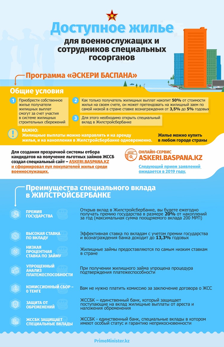 По условиям программы «Әскери баспана», военнослужащие, накопившие всего 5% от стоимости квартиры, могут получить кредит по ставке 7% годовых. Условие — квартиру можно приобрести только на первичном рынке: те, кто накопил 20% от стоимости квартиры, смогут оформить кредит на приобретение нового жилья от застройщика под 6% годовых. Военнослужащие, которые хотят приобрести жилье на вторичном рынке, должны внести 20% от стоимости недвижимости, а годовая ставка по кредиту составит 8%.