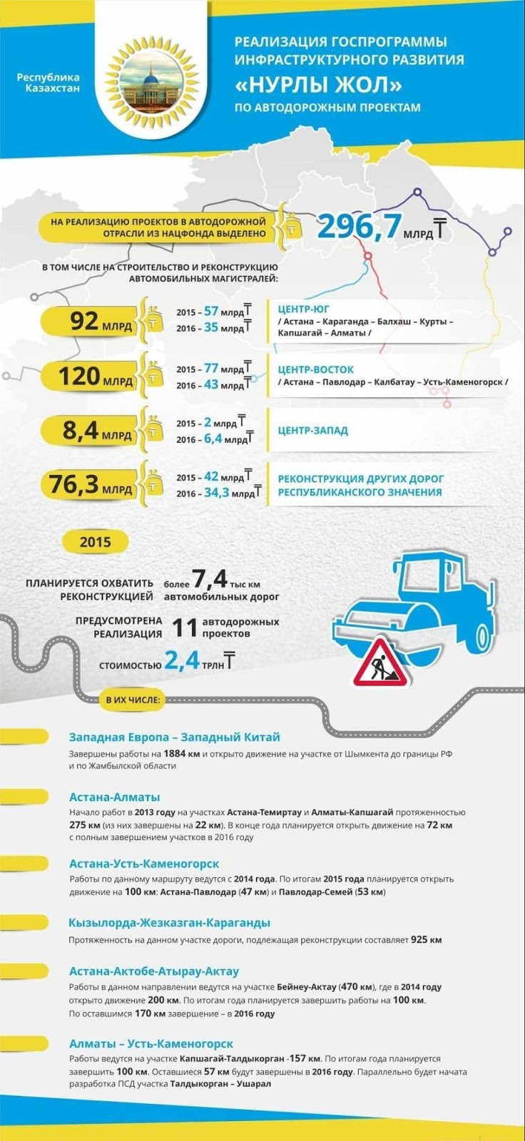 Сегодня реализация государственной программы «Нұрлы жол» идет полным ходом, в текущем году из государственного бюджета на ее проекты выделено 484 млрд тг. В основном это долгосрочные проекты — автомобильные и железные дороги, водоснабжение, инженерные коммуникации.