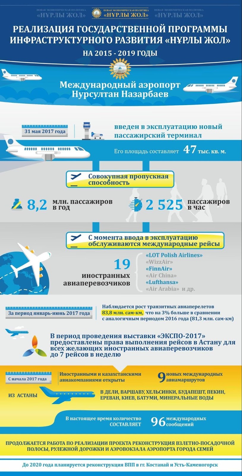 В 2017 году из запланированных 700 км инженерных сетей построено и реконструировано 686,6 км, из них сетей теплоснабжения 17 км, сетей водоснабжения и водоотведения 669,6 км. В 2017 году из средств Нацфонда на строительство 109 школ выделено 68,1 млрд тг. По состоянию на 1 декабря текущего года в местные бюджеты перечислено 65,2 млрд тг, из них МИО освоено 62,5 млрд тг. К 1 декабрю 2017 года по отчетам акиматов введены в эксплуатацию 64 объекта образования. Также в 2017 году были открыты второй железнодорожный вокзал и новый терминал аэропорта в Астане.