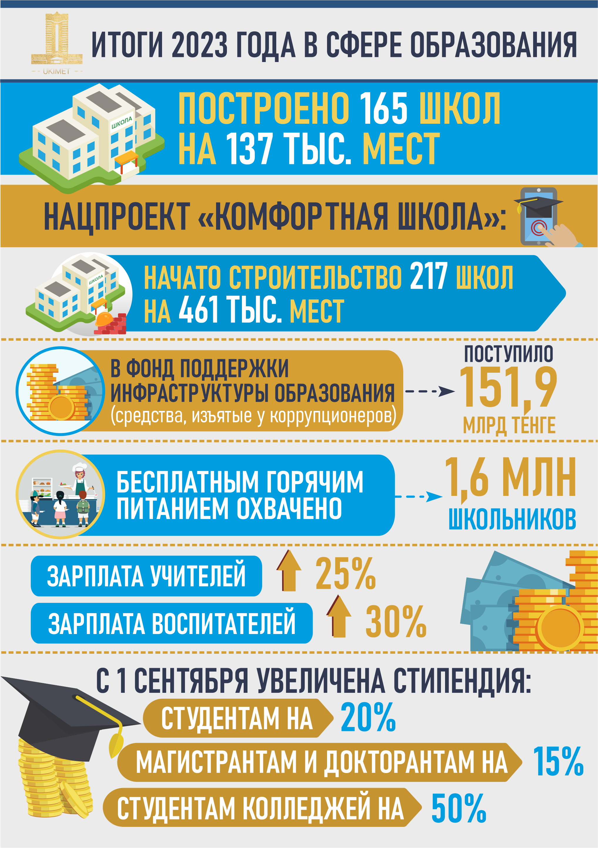 С момента создания Фонда поддержки инфраструктуры образования (средства, изъятые у коррупционеров) на специальный счет поступило 151,9 млрд тенге. В результате профинансировано строительство 62 школ на 76,7 тыс. ученических мест на общую сумму 96,5 млрд тенге. По состоянию на 1 декабря текущего года в эксплуатацию введено 17 школ для 28,6 тыс. учеников.