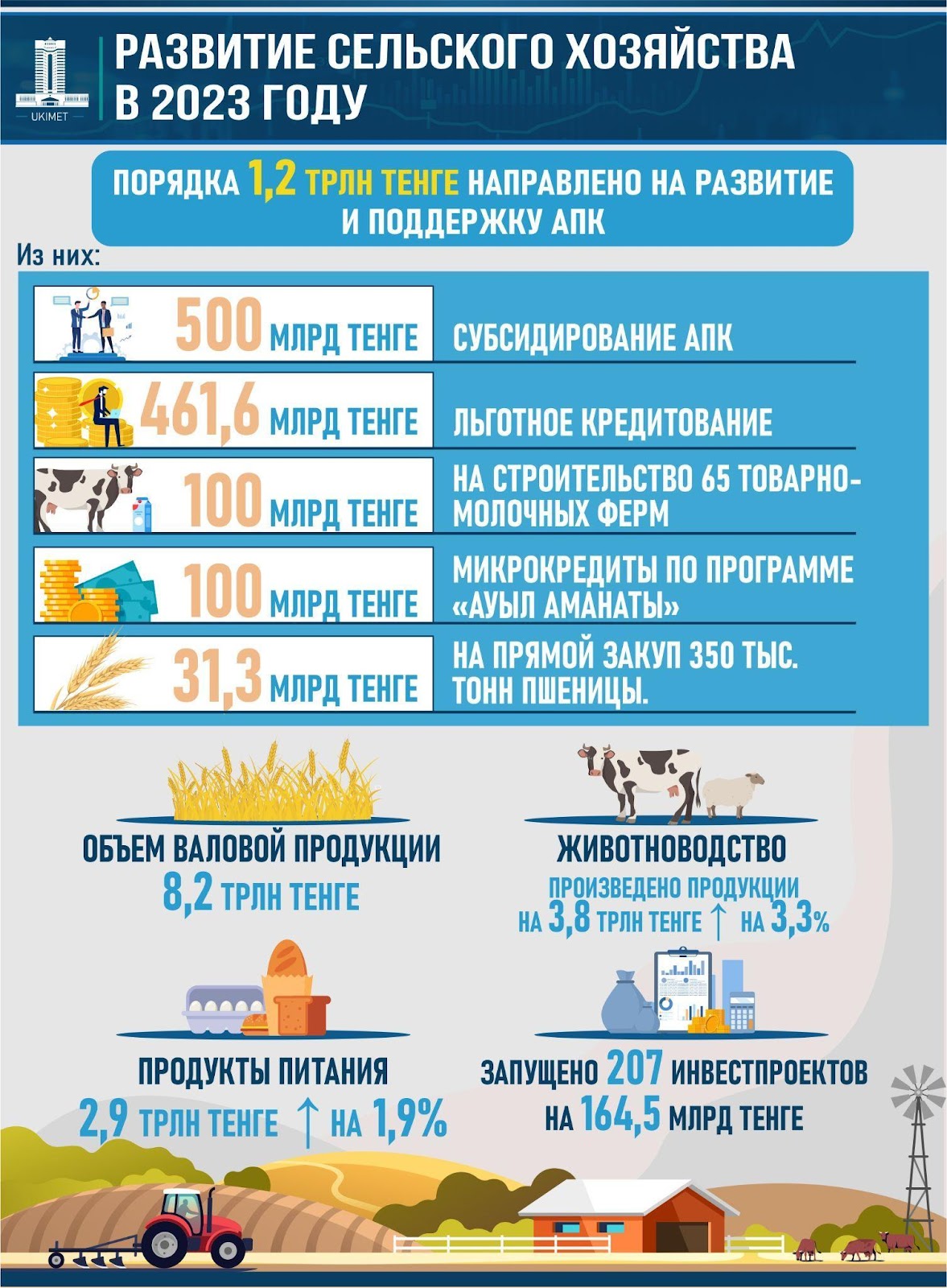 Таким образом, на развитие и поддержку отрасли сельского хозяйства в 2023 году государством было направлено порядка 1,2 трлн тенге. В целом принятые меры улучшат финансовое состояние аграриев и позволят им своевременно подготовиться к посевной кампании 2024 года.