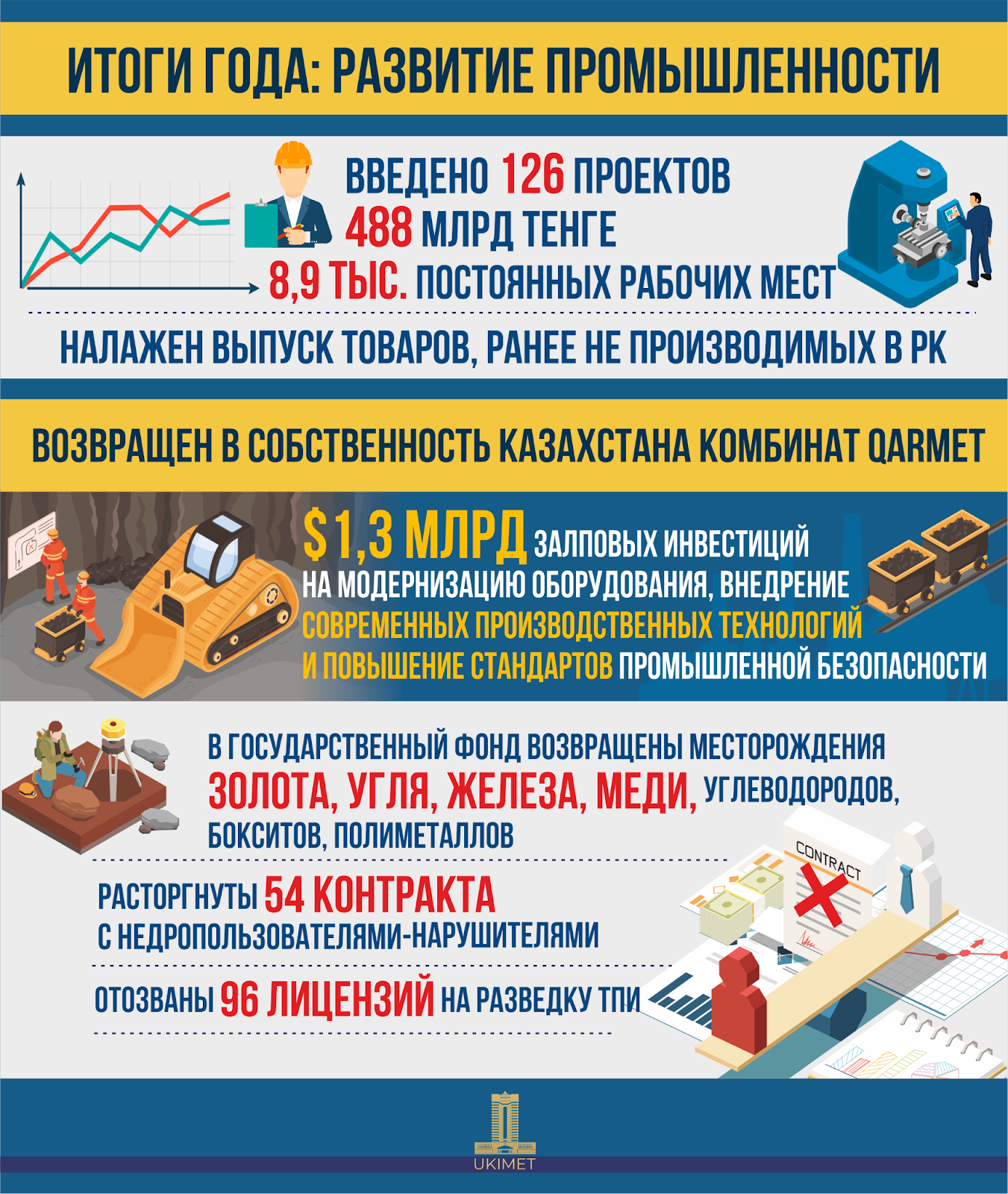 ● Одним из значимых достижений нынешнего года стал возврат в собственность Казахстана комбината Qarmet. Соглашение между Правительством Казахстана и ArcelorMittal можно назвать мега-сделкой, которая имеет исключительное значение для нашей страны. Со сменой собственника в предприятие на первом этапе будет вложено $1,3 млрд частных инвестиций. Эти средства пойдут на модернизацию оборудования, внедрение современных производственных технологий и повышение стандартов промышленной безопасности.