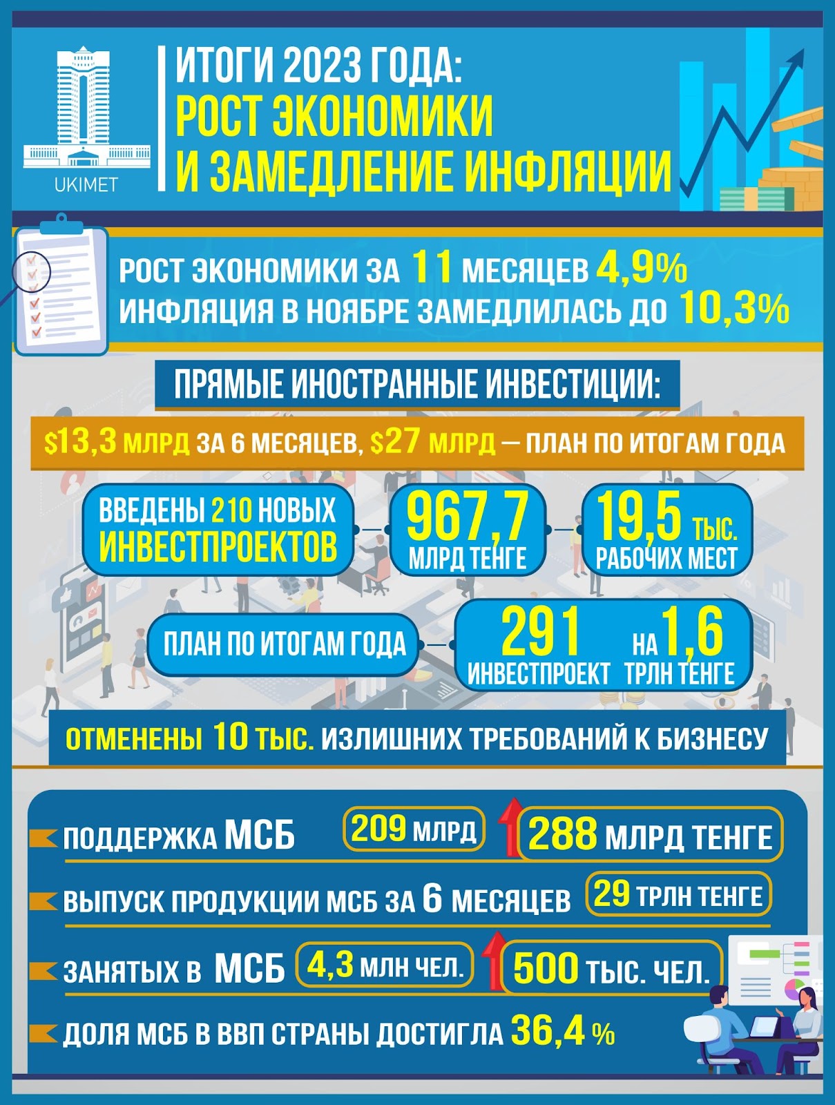 В целом принятые государством меры позволили нарастить выпуск продукции МСБ с 23 трлн тенге за 6 месяцев 2022 года до 29 трлн тенге за аналогичный период этого года. Количество занятых в МСБ граждан выросло на 500 тыс., до 4,3 млн человек. Доля МСБ в ВВП страны при этом достигла 36,4%.