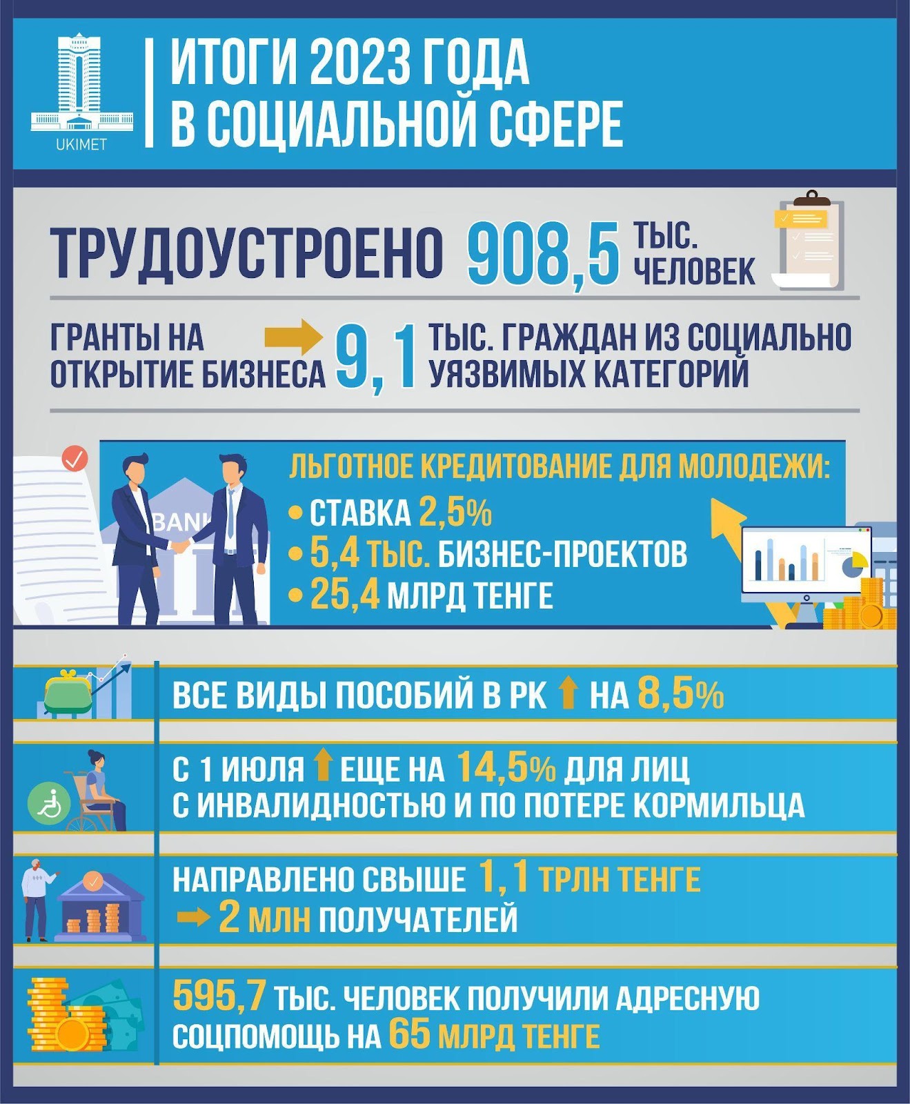 Вопросам поддержки и развития социальной сферы в Казахстане традиционно придается приоритетное значение: государство ведет работу по созданию рабочих мест и повышению зарплат граждан, реализуются различные госпрограммы социальной помощи, выделяются средства на модернизацию соответствующей инфраструктуры.