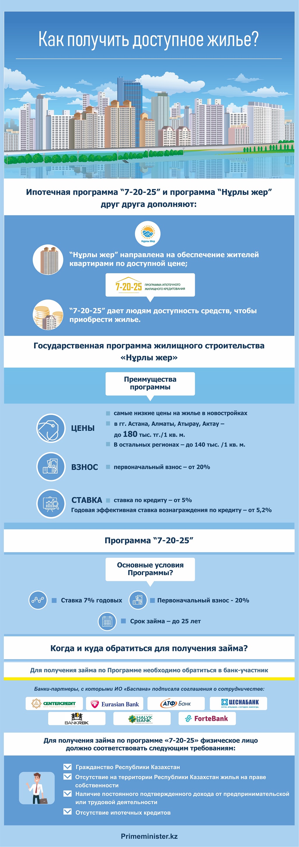 Вице-министр индустрии и инфраструктурного развития РК Каирбек Ускенбаев отметил, что ипотечная программа «7-20-25» и программа «Нұрлы жер» дополняют друг друга. Так, программа «7-20-25» дает возможность доступности средств для приобретения жилья. «Нұрлы жер» направлена на обеспечение населения квартирами по доступной цене.