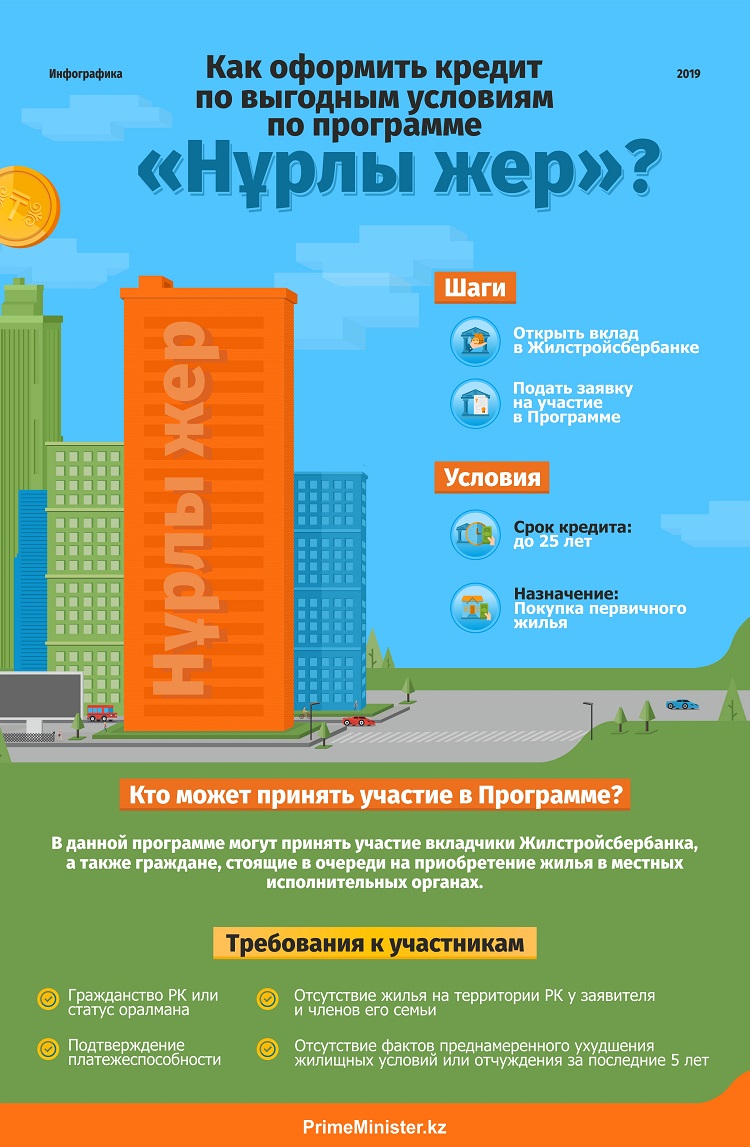 Программа «Нұрлы жер» предоставляет самые льготные условия в стране. Во-первых, надо иметь гражданство РК или статус оралмана, во-вторых, в течение последних 5 лет вкладчик не должен иметь жилья. По условиям программы, стоимость 1 м² сдаваемого жилья фиксированная и составляет 180 000 тг в Астане, Алматы, Атырау и Актау. В остальных регионах цена не превышает отметку в 140 000 тг.