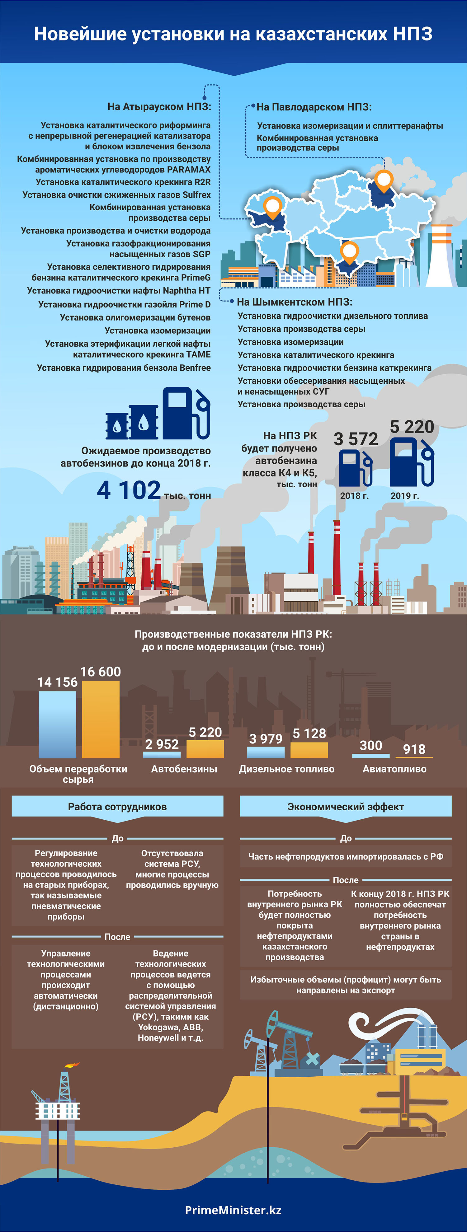 После модернизации НПЗ/НХЗ увеличивается не только количество, но и качество получаемых нефтепродуктов. Ранее выпускались нефтепродукты экологического класса К2, после модернизации класс К4, К5. Как известно, чем выше экологический класс бензина потребляемый авто/мототранспортом, тем меньше выбросы вредных паров в атмосферу, что играет немаловажную роль в экологии РК.