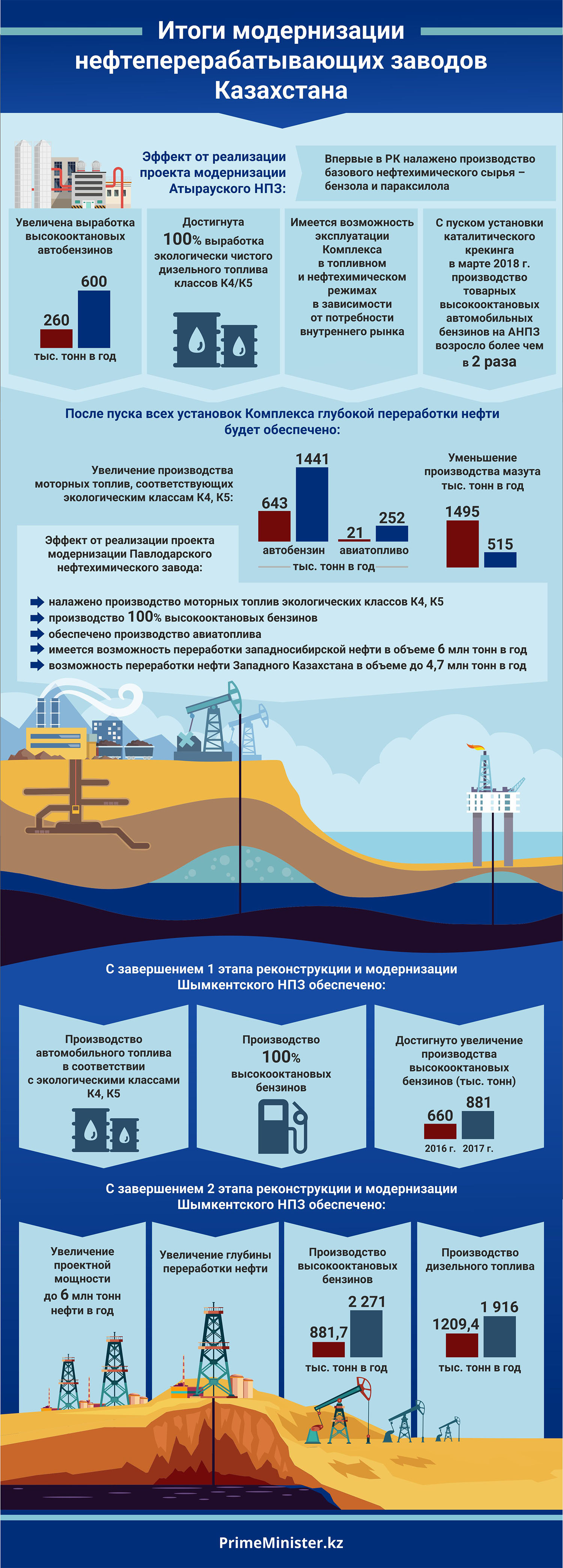 — Модернизация Павлодарского нефтехимического завода была завершена в декабре 2017 года. Одновременно была завершена и модернизация Атырауского нефтеперерабатывающего завода. Ранее в сентябре 2016 года был завершен проект «Строительство Комплекса по производству ароматических углеводородов (КПА) на Атырауском НПЗ». На стадии запуска находится проект «Строительство Комплекса глубокой переработки нефти (КГПН) на Атырауском НПЗ».